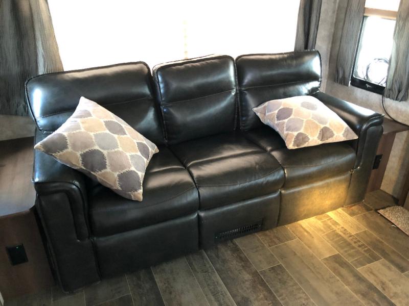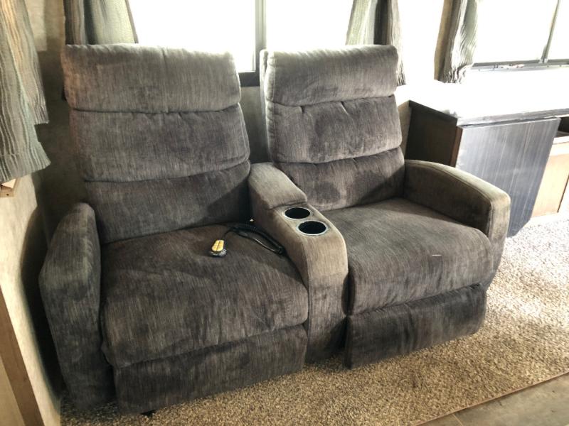 The slide opposite the door side features a dining table with four chairs, and theater seating for two with cup holders and overhead storage. Along the rear wall find a sofa with end tables and storage above that stretches across the rear wall.