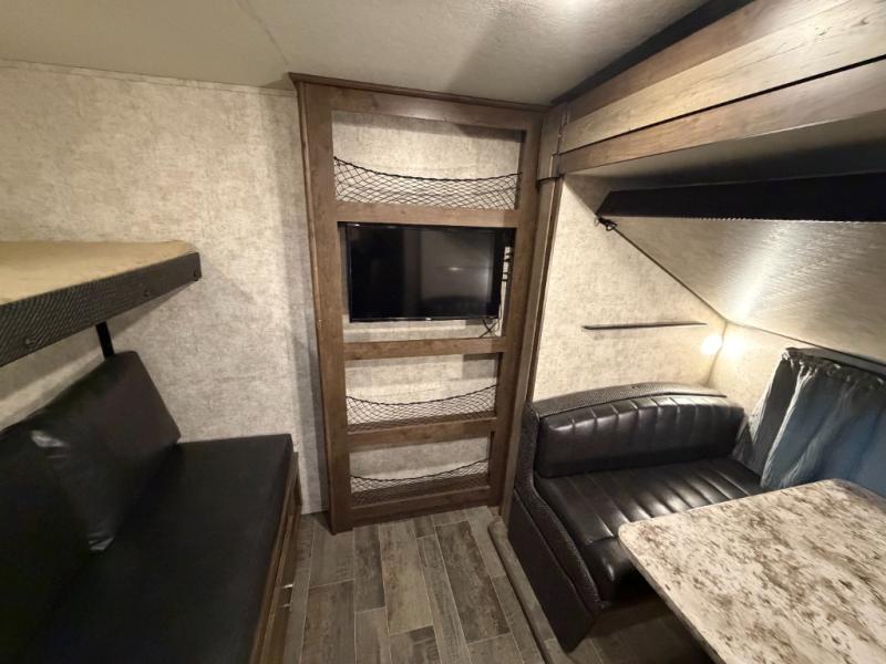 Heading towards the rear of the trailer you will enter the private bunkhouse. Inside there is a slide out jiffy hide-a-bed sofa below a hinged bunk along the road side wall. Adjacent there is a convenient half bath. Along the rear wall you can enjoy a 29" TV if you choose that option, and a hutch for storing movies, toys, and games. A set of bunks and a ladder are located on the opposite side as the slide out allowing for more sleeping space. There is wardrobe in the corner for your camping clothes.