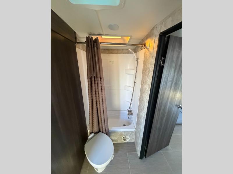 The stainless steel kitchen appliances are to the left of the front most entry, and the kitchen space begins with an angled counter and double sinks. There is also a three burner range and refrigerator for all of your cooking and cold food storage needs. There are overhead cabinets above the sink for your dishes, and a pantry opposite the refrigerator will easily store your extra dry and canned goods. For dining, you will love the space available at the large u-shaped dinette slide out along the roadside wall. This can also be made into added sleeping space at night when needed. A TV entertainment center is located adjacent from the dinette in the center of the front interior wall, and it features a 39" TV for easy viewing.