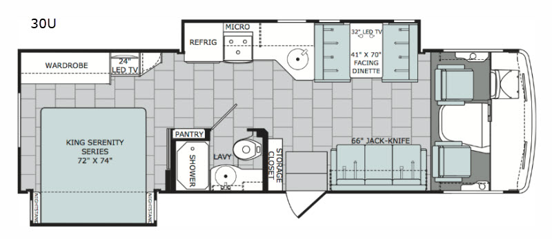 This Holiday Rambler Admiral XE features a spacious interior with double slide outs. There is one large slide out in the main living area, plus a second slide out is located in the rear bedroom. Your meals can be shared with family and friends at the 41"x70" dinette plus across the room there is a 66" jack knife sofa where you can relax in the evening. The master bedroom features a king Serenity Series bed, a 24" LED TV, and a large wardrobe for your hang up clothes and more!