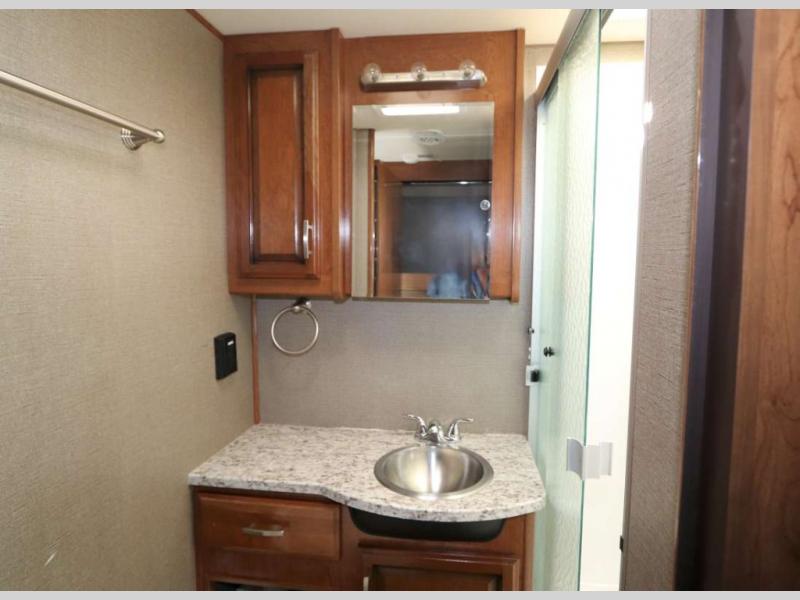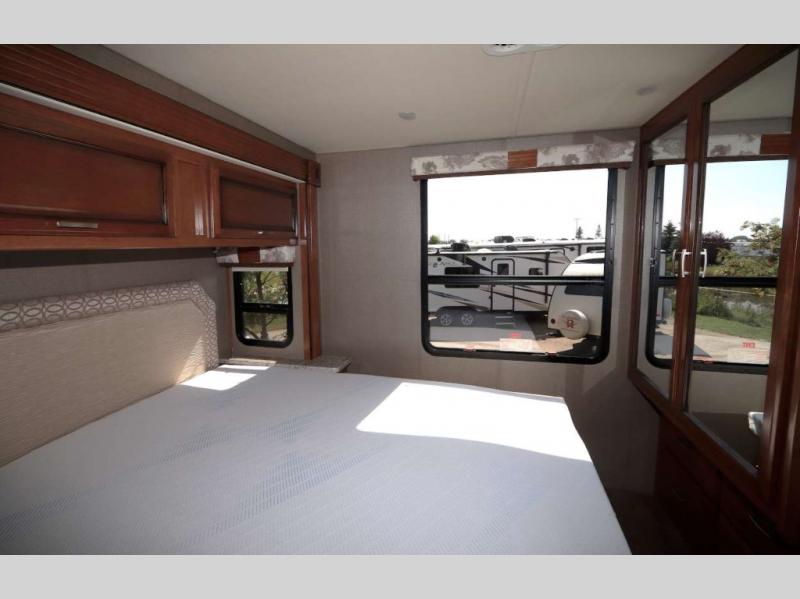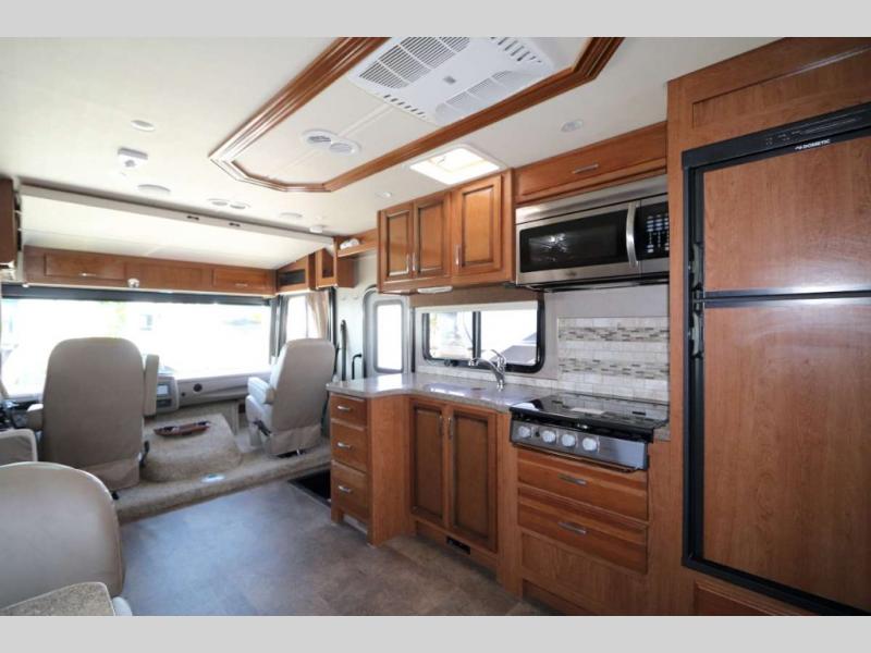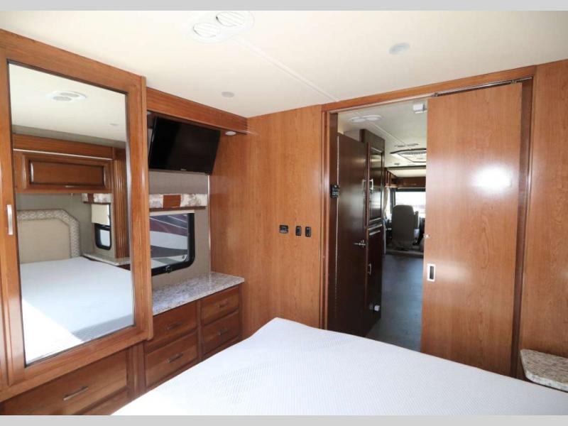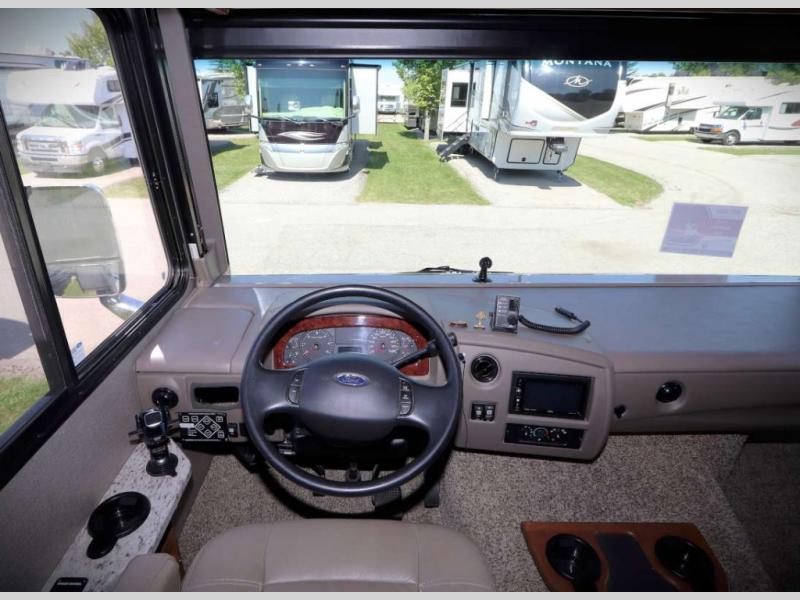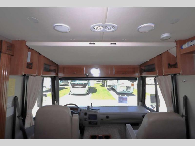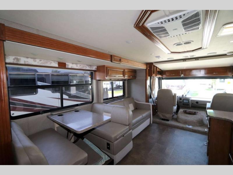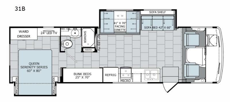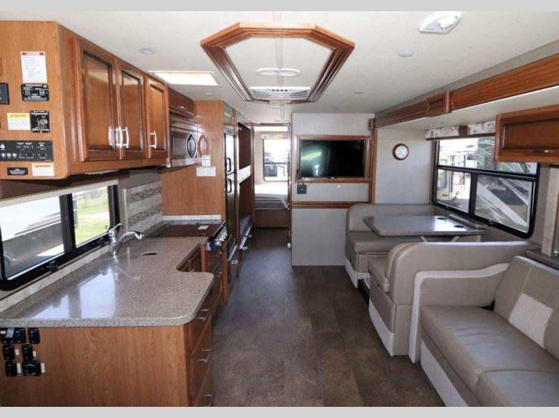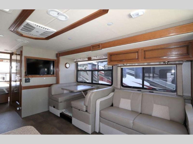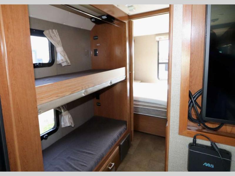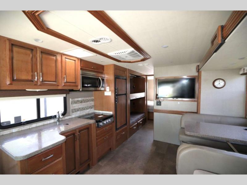 Get ready for your next cross country trip with this luxury double slide out Admiral 31B class A motor home. This model features sleeping space for up to seven people. Your kids will enjoy the 25" x 70" bunk beds, mom and dad will enjoy the queen Serenity Series bed, and the 41" x 70" dinette plus the 42" x 60" sofa both convert into additional sleeping space. You can watch a movie or your favorite show at the 40" LED TV along the interior wall in the living area and more!
