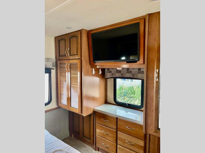 In the master you will enjoy a great night's rest on the king bed provided. The bed slides out along the curb side to give you more walking around space. There is also overhead storage for your belongings. Opposite the bed find plenty of clothing storage in the full-length wardrobe, and within two additional wardrobes including a dresser and 32" LED TV in between.