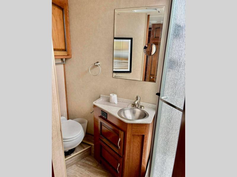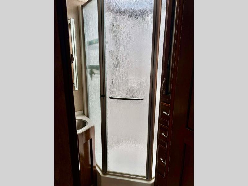 As you continue toward the rear of the coach you will find a complete bath along the curb side that includes an angled shower, a vanity with sink, and toilet. There is also a linen cabinet for your towels and toiletries.