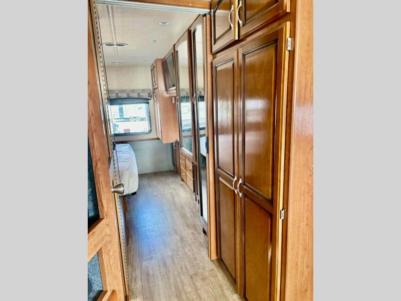 Just outside the bathroom door along the road side you will find a large pantry. Sliding pocket doors can be found next to the pantry that allow you to close off the rear master bedroom space from the rest of the coach.