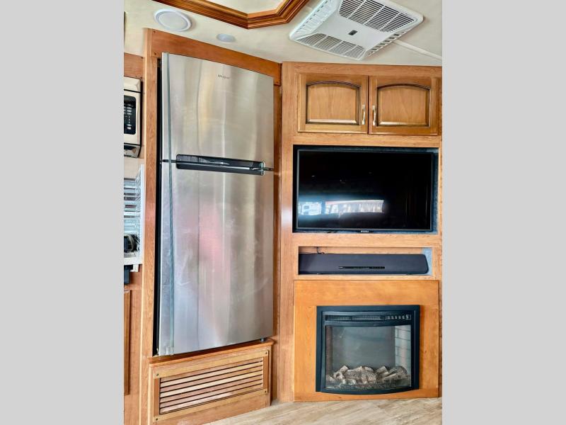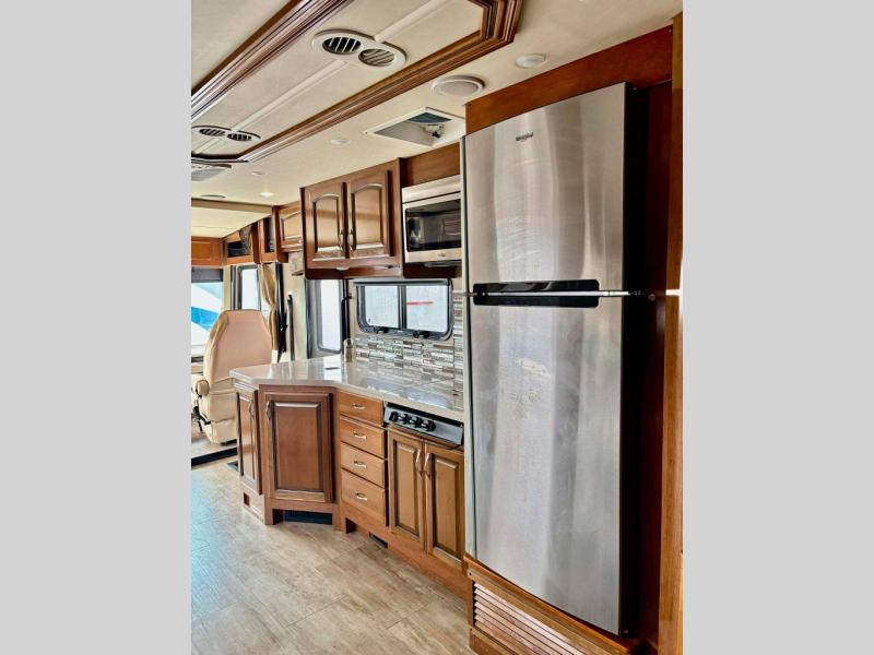 Step inside and take a look back. This unit starts with the kitchen and dining area up front. Just behind the passenger seat and to the left of the entry door you will find a residential refrigerator, a three burner range with overhead microwave oven, and a double kitchen sink. There are plenty of storage cabinets overhead, and space for kitchen items below. Once your meal has been prepared enjoy dining at the 42" x 76" booth dinette that begins the large road side slide.
