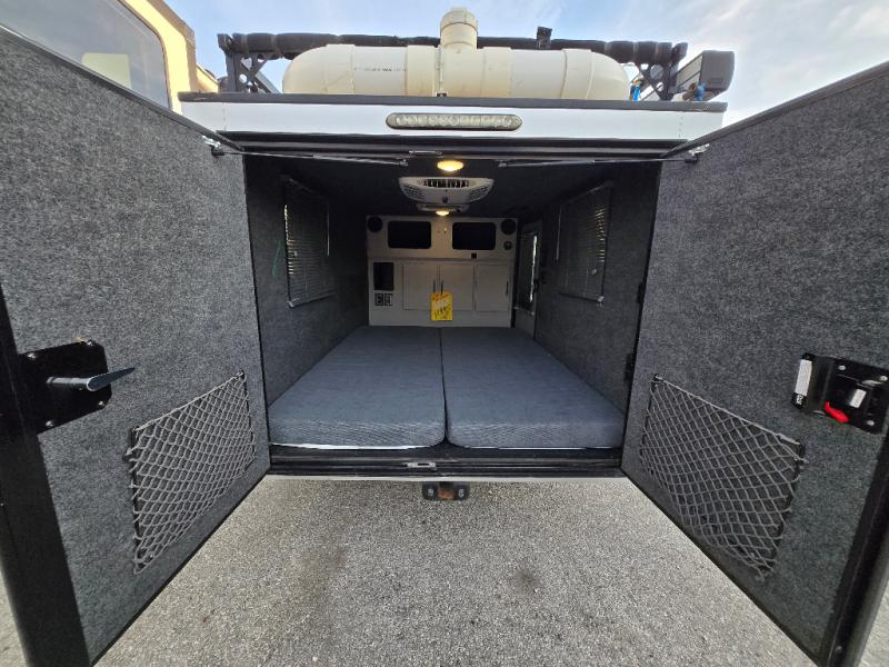 Pursue your next adventure with this Pursue Flyer model in tow behind your family car, SUV, or truck. This micro-lite unit is slightly larger than the Chase Flyer, and is ready to take your camping to the next level. With the Pursue Flyer you will find loading is easy with the rear double doors, plus side entry. Two nice windows allow you a view as well as cross ventilation inside. This model easily sleeps two inside, and you can add the optional Add-a-Tent for additional space if you wish. The Pursue also allows you the option of adding a slide out L-shaped kitchenette. You simply unlatch a door and slide out your kitchen which features a 120V/12V refrigerator plus two-burner cook-top, and storage. There is also a flip-up counter along the front which creates the L-shape. Like the Chase Flyer model, you can also add the optional Suneeker or Foxwing awning, or off-road tires if you enjoy a bit more rugged terrain for camping!