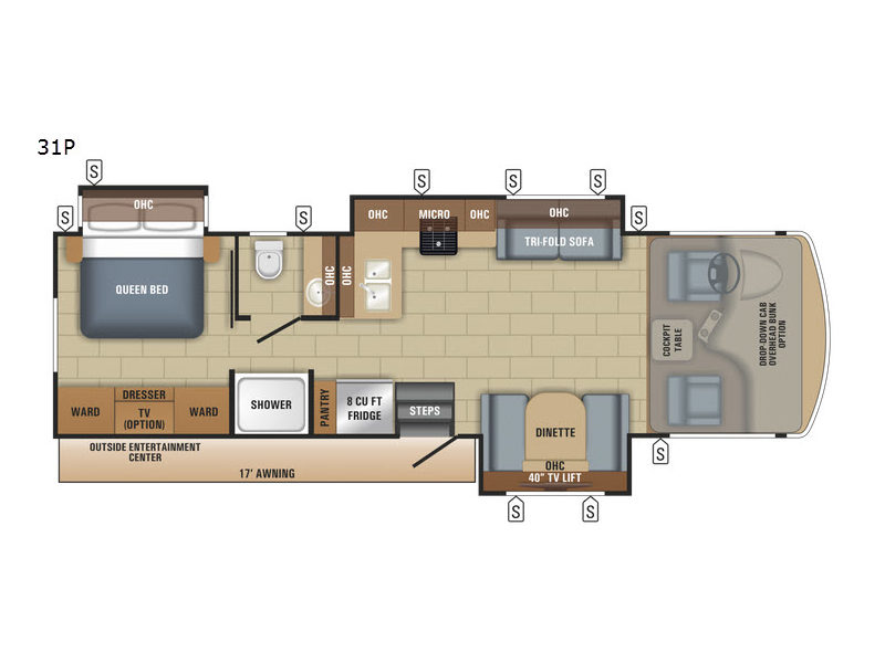 | TV Info | LR 40" lift LED, Ext. TV, BR TV Option |