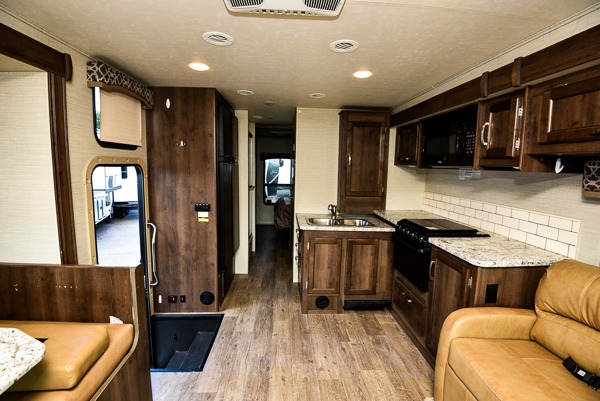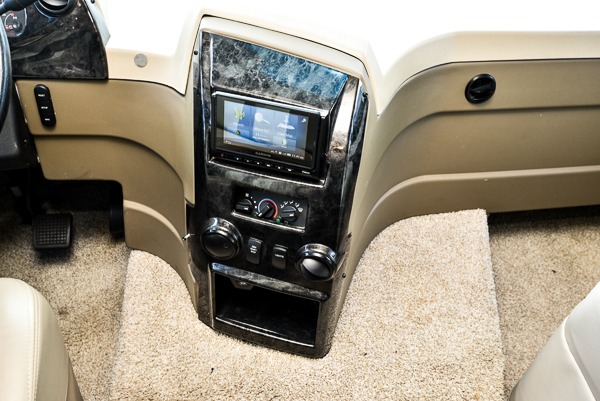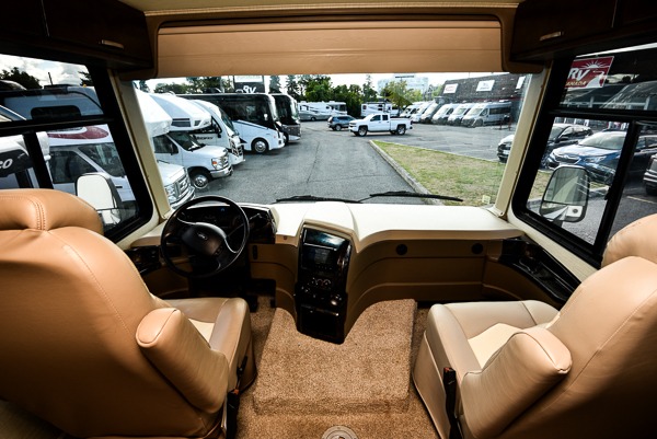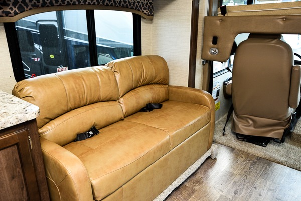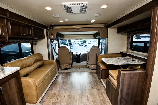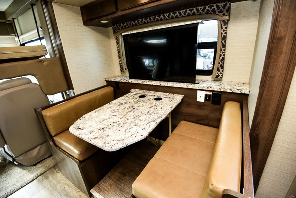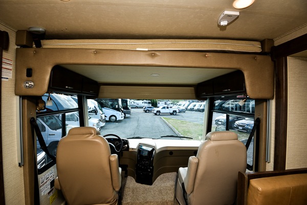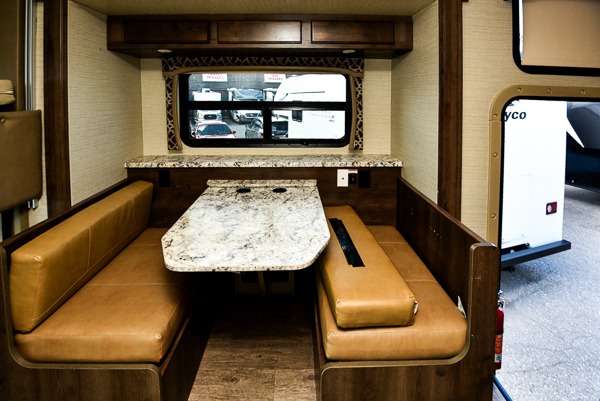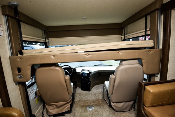 Above the cab seats in front there is a drop-down bunk option you can choose. This is great for children, or an adult. Beneath it notice the cockpit table that is perfect for enjoying your morning coffee or a snack even while you are on the move.