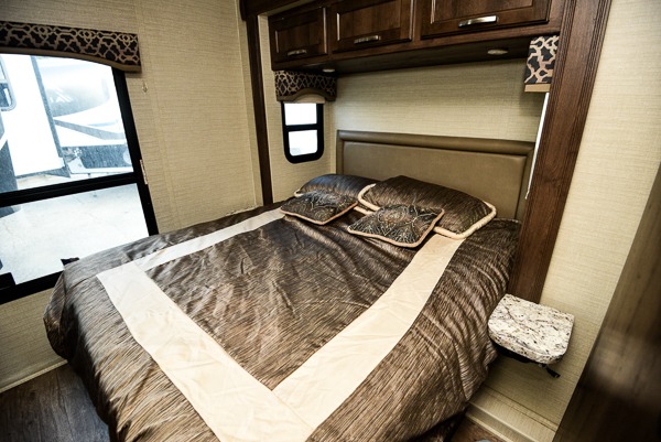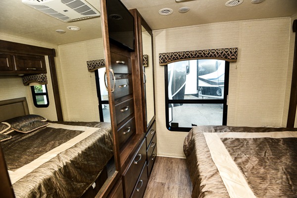 A sliding door leads into a rear master bedroom which also features a nice slide for added roominess. The road side features a queen bed slide with overhead storage and nightstands. Opposite the bed you will find plenty of storage for all of your clothing and personal belongings. You can even add a TV if you wish.