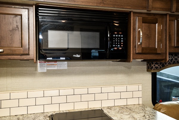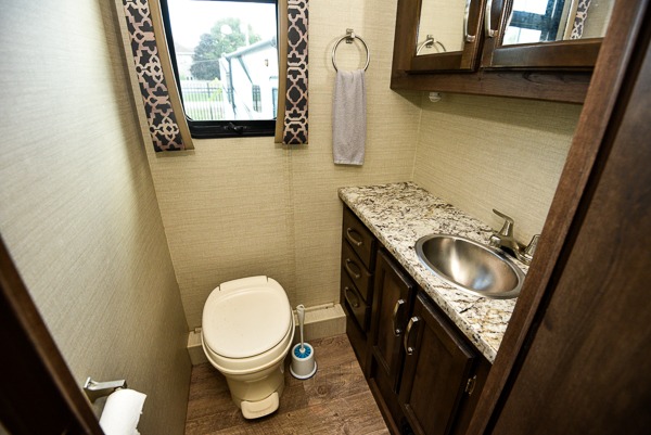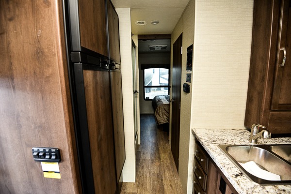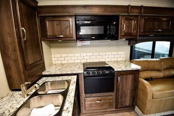 You will easily be able to cook meals and snacks for your family with the kitchen amenities provided. There is an 8 cu. ft. refrigerator or choose a 12 cu. ft. refrigerator, and a pantry to the left of the entry door. Opposite, along the interior wall, you will find a double sink, and a counter which curves around and becomes part of the slide out where you will find a three burner range with overhead microwave oven and storage.
