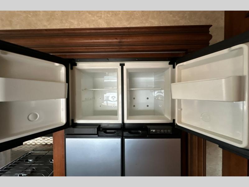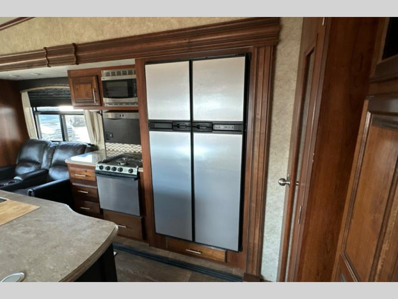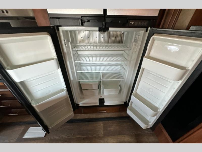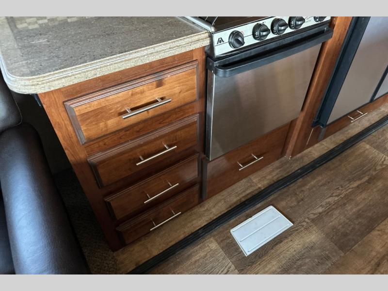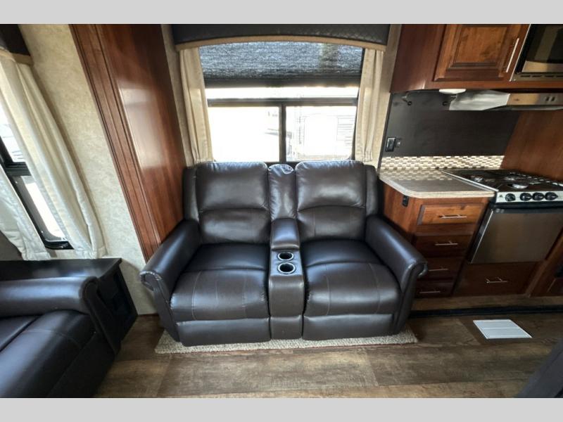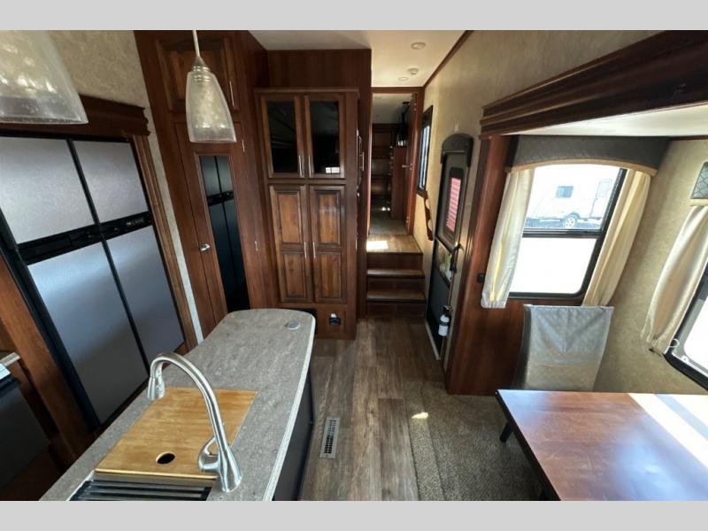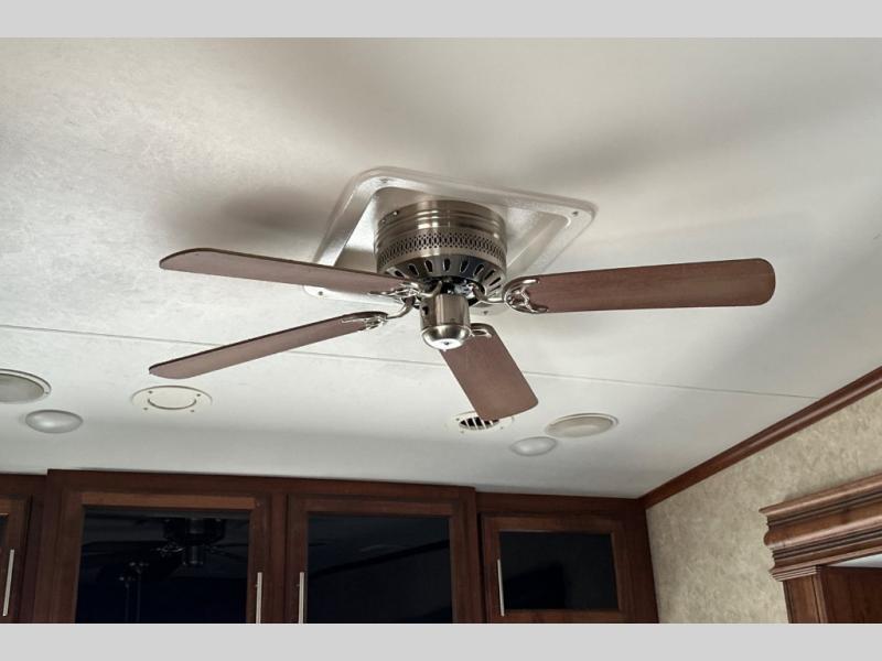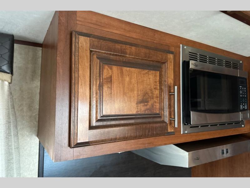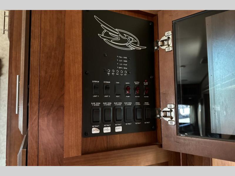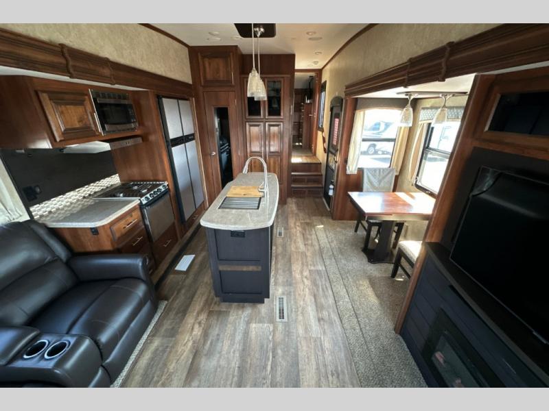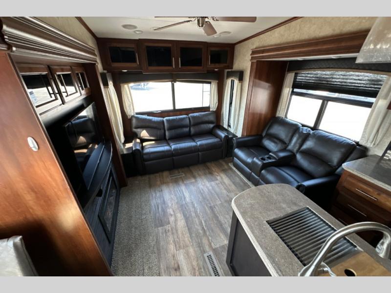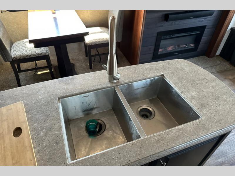Life just got much more comfortable and luxurious when you take this Eagle fifth wheel to your favorite destinations. Model 317RLOK offers the owner a master bedroom with plenty of storage and a closet prepped for a washer/dryer. The dual slide outs in the main living and kitchen area provide enough room to walk around the kitchen island to get to the residential-style walk-in pantry, or near the LED fireplace on those chilly nights away. You will even find a ceiling fan and theater seats. If you need more entertaining and cooking space, the outside kitchen offers that area. It's time to enjoy your own accommodations wherever you land.