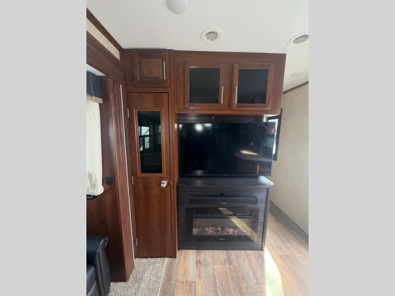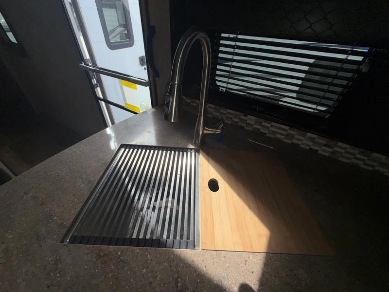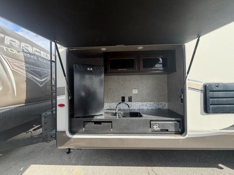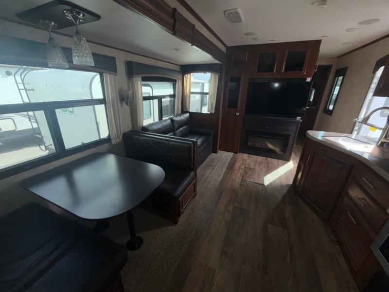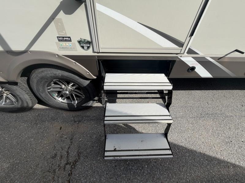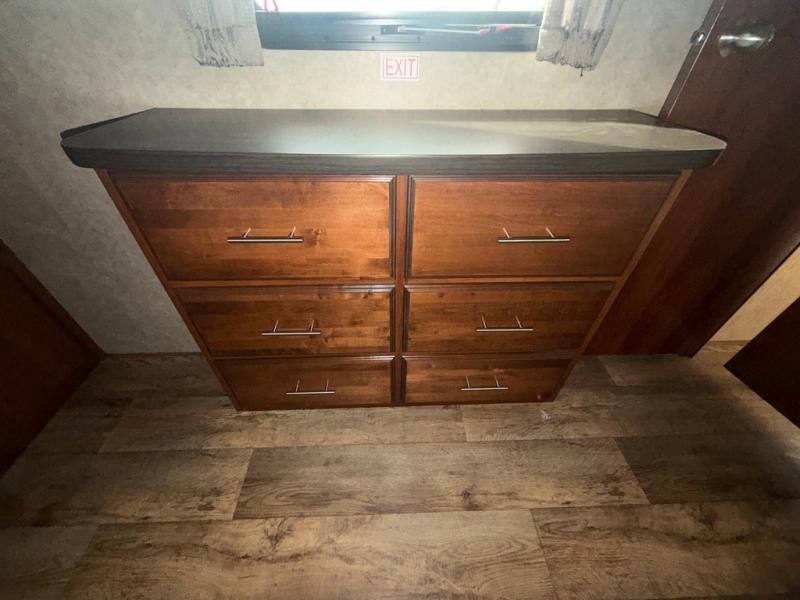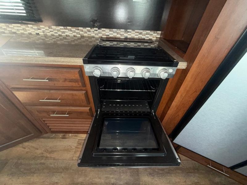 If you like to travel in luxury with your whole family, take a step inside this Eagle travel trailer to find a rear bunkhouse and a front master bedroom. Model 333BHOK provides the children a place to call their own in the bunkhouse with two bunk beds and gamer chairs, plus more! The owner will enjoy the master bedroom with plenty of storage and a closet prepped for a washer/dryer on the opposite side of the trailer. Everyone can come together to watch TV, play games, and cook. There is plenty of room for your dry goods in the dual pantries, and the LED fireplace will keep you cozy on those chilly camping evenings. If you enjoy cooking in the great outdoors, the outside kitchen might be one of your favorite hangouts. Now imagine your whole family making memories with this Eagle travel trailer everywhere you stop!