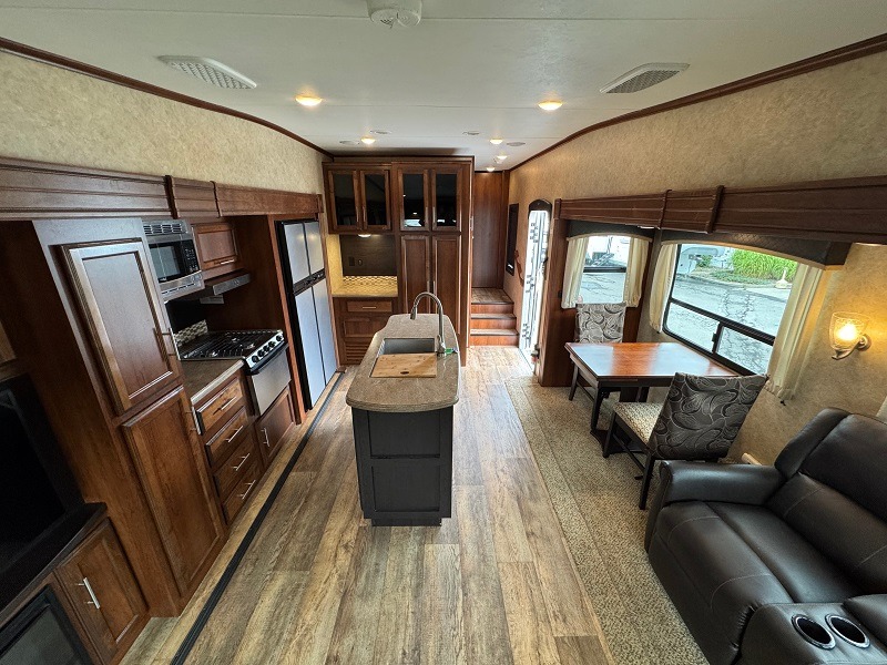 You will want each camping trip to extend just a little bit longer when you choose to camp with this triple slide out 30.5CKTS Eagle HT fifth wheel. Jayco has thought of everything from the spacious living area with a tri-fold sofa to the kitchen island with a double sink in the kitchen. The slide out along the curbside features a free-standing table with lounge chairs or you can choose an optional booth dinette and theater seats - the choice is yours! In the private master suite there is a queen bed, and plenty of storage with the wardrobes, nightstands, and dresser. Outside you will enjoy the shade from the 14' electric awning with LED lights, plus there are integrated LED lights on the awning so now you can sit outside and visit with your family or friends longer!