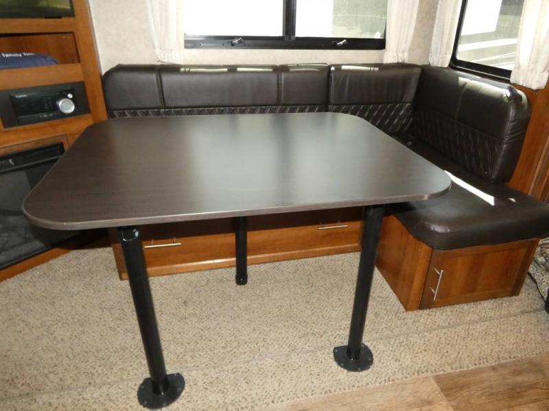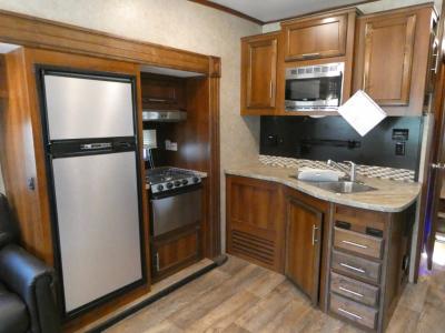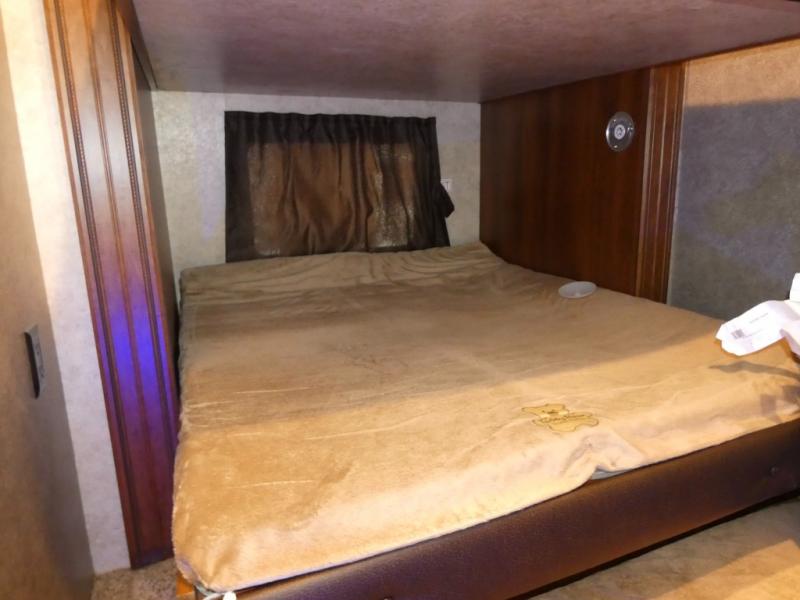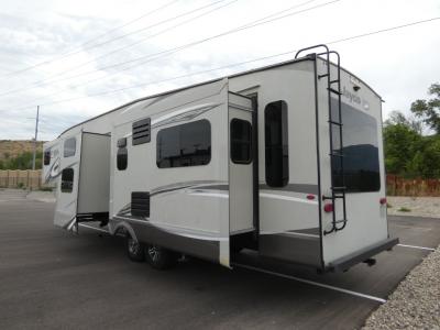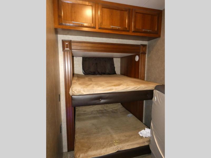 When you are ready to set out on your next camping trip, load your family, your camping gear, and enjoy your time away in this fifth wheel! Model 30.5MBOK features quad slide outs as well as a rear living area plus you can choose an optional L-dinette with a folding table which converts into a 42" x 70" bed if needed. Straight in from the entry door is the mid-bunk room with a 48" x 60" upper bunk and a 48" x 72" lower bunk. With the queen bed in the private front bedroom and the tri-fold sofa this fifth wheel can easily sleep nine people. Outside there is a 19' awning plus an outside kitchen with a refrigerator and a two burner pull out cooktop plus so much more!