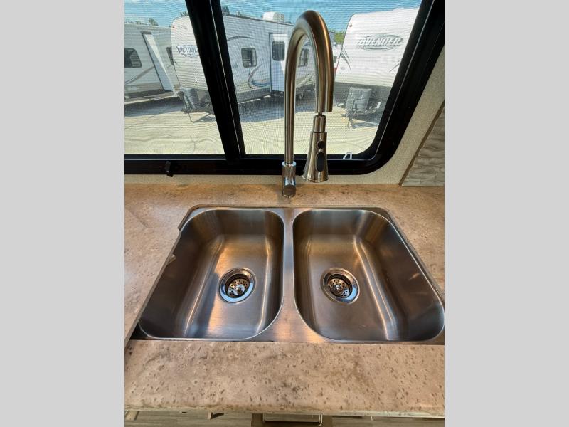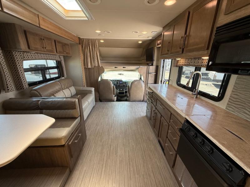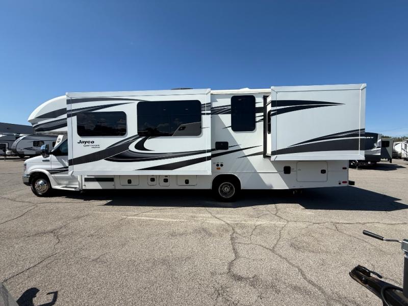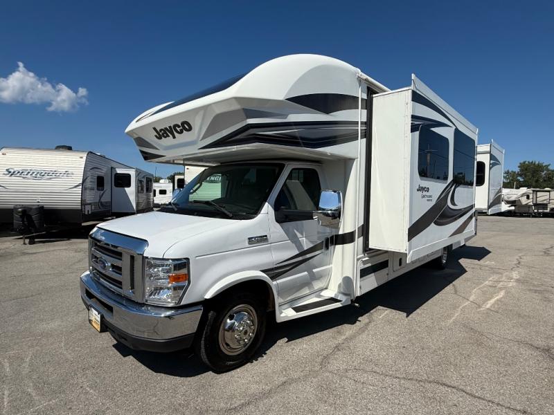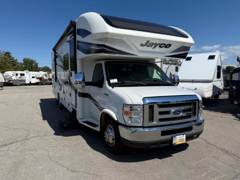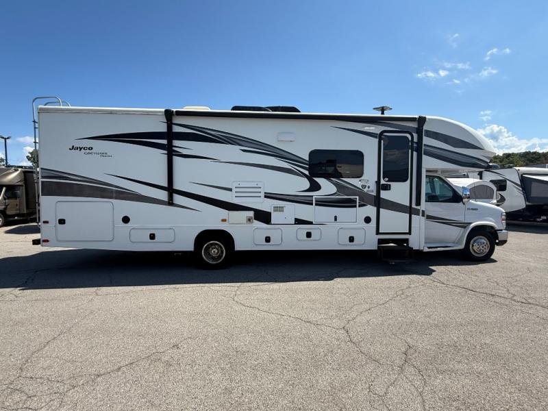 Get ready for a comfortable and fun traveling and camping experience with the Jayco Greyhawk class C motor home. The fiberglass exterior has vinyl graphics, a seamless fiberglass front cap and a one-piece fiberglass roof. In the kitchen you will find beautiful Sienna Maple cabinets, elegant countertops, and a stainless steel sink. Throughout each model there are vinyl floors, LED lights, and ball-bearing drawer guides. When you are ready for a little rest and relaxation in the evening then come to the comfortable bedroom where you will find plenty of residential touches which include a queen bed plus a 24" LED TV! The mandatory Customer Value Package includes features such as a JRide Plus, a Jayco-exclusive Garmin Infotainment System, remote-controlled, heated sideview mirrors, frameless windows, plus more! What are you waiting for, come enjoy the ride with a Greyhawk!