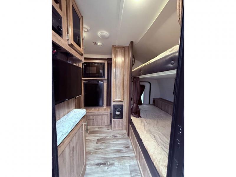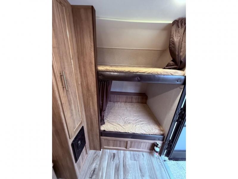 Are you ready to make plenty of memories with your family while camping in this Jayco Hummingbird 17BH? Your kids will love the front bunk beds. Inside you will also enjoy all of the storage space throughout from the overhead cabinets to the storage shelves. You will also enjoy the convenient wet bath so now you won't have to use the campground bathroom to get cleaned up. Outside there are a few key features that you will enjoy from the Goodyear radial tires with self-adjusting brakes to the 9' power awning with multi-functional, multicolored LED lights. The lights from the awning are easily controlled with the touch of a remote!