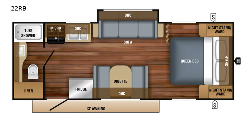 This Jayco Jay Feather travel trailer model 22RB is perfect for a couple, or even a family of four. Whether you are just getting started in the world of camping, or have been camping for years, you will appreciate all of the amenities inside, plus how easy this lightweight is to tow! There is a convenient rear bathroom where you can adequately get ready for your day. The sofa slide out along the roadside helps to open up the floor space plus this area can be used for a sleeping spot at night. When you are ready to retire for the night you can do so on the queen Jayco-exclusive Simmons mattress, plus there are nightstands for your reading material. Outdoors enjoy the shade of the 13' awning and the integrated LED lights allow you to keep the party going longer!