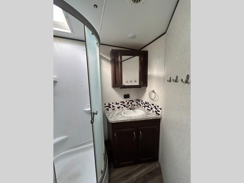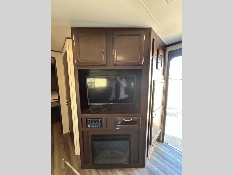 You'll have a grand time getting away with this Jay Flight travel trailer! You'll stay comfortable on the queen-size bed in the front private bedroom. When you enter this trailer, there is an entryway closet directly to your right, so you can store coats and shoes easily. The entertainment center gives you the chance to add an optional fireplace below which will make your time spent on the jackknife sofa even more enjoyable. The private bunkhouse has the second entertainment center and storage area.