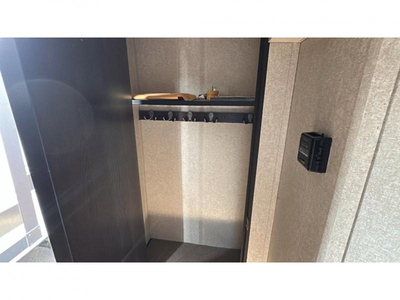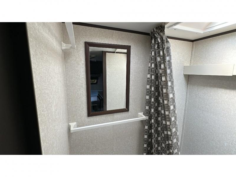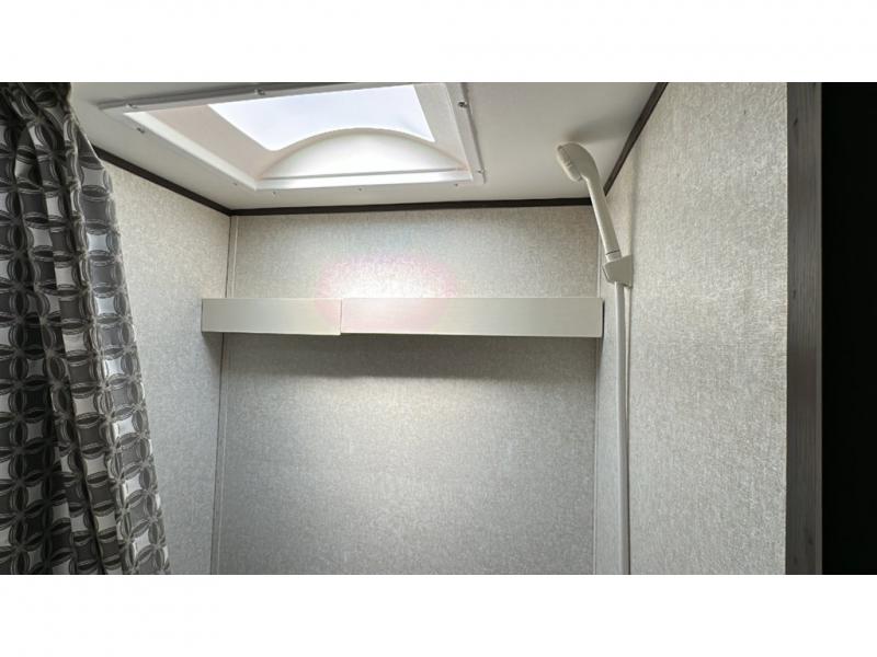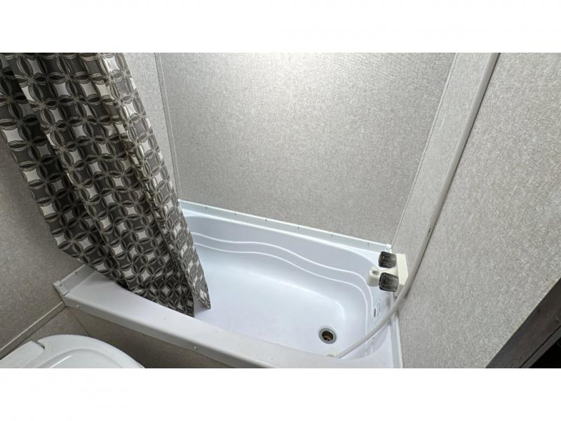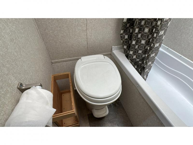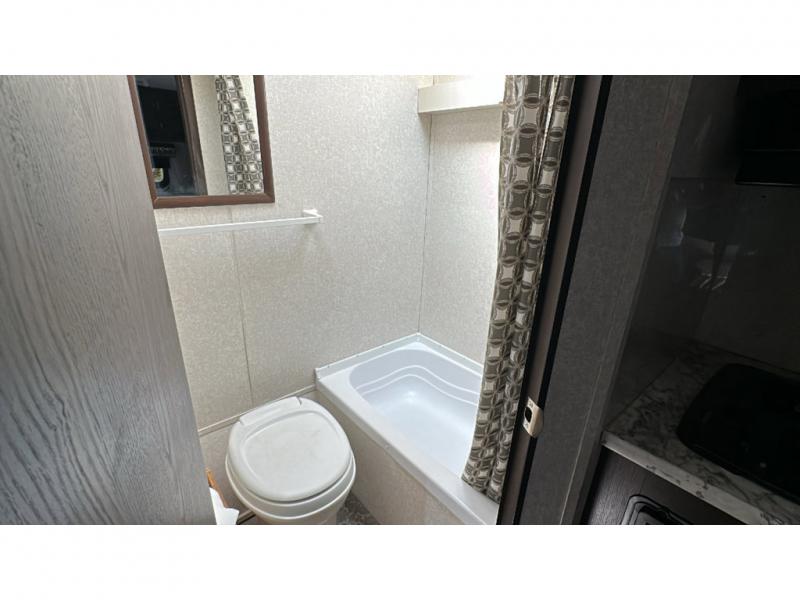 Inside this travel trailer, you will find a wardrobe to the left of the entry door, and a rear bath. In the bath there is a tub/shower, and toilet.