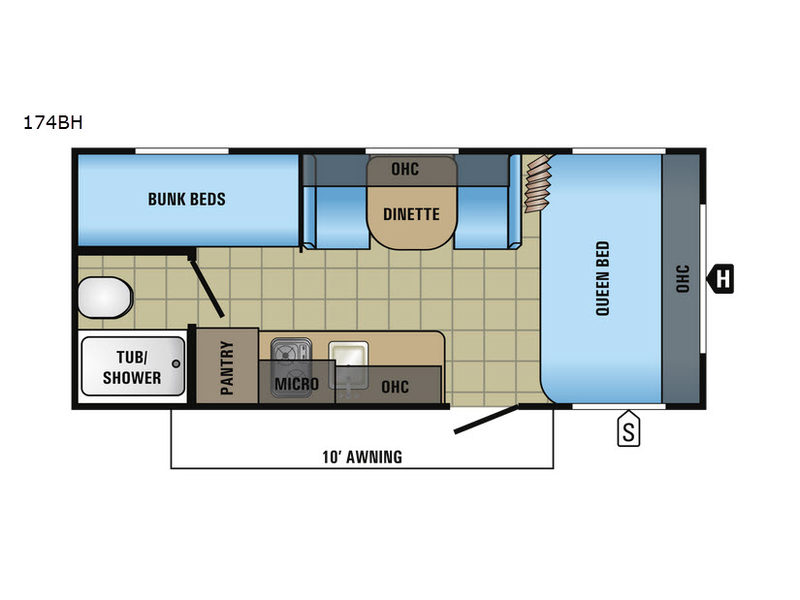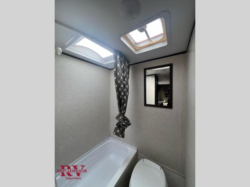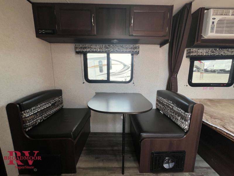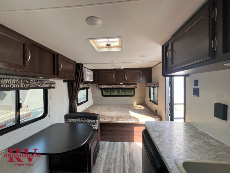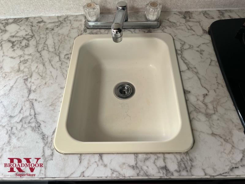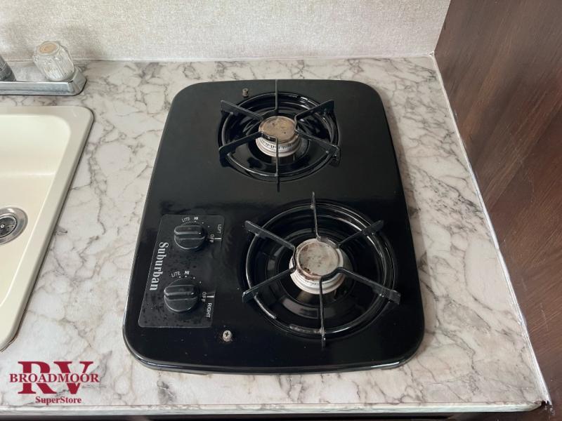 You can enjoy your meals at the booth dinette, and at night it easily converts into additional sleeping space. Along the opposite side there is a large pantry, two burner range, microwave, single galley sink, and a refrigerator below the counter.