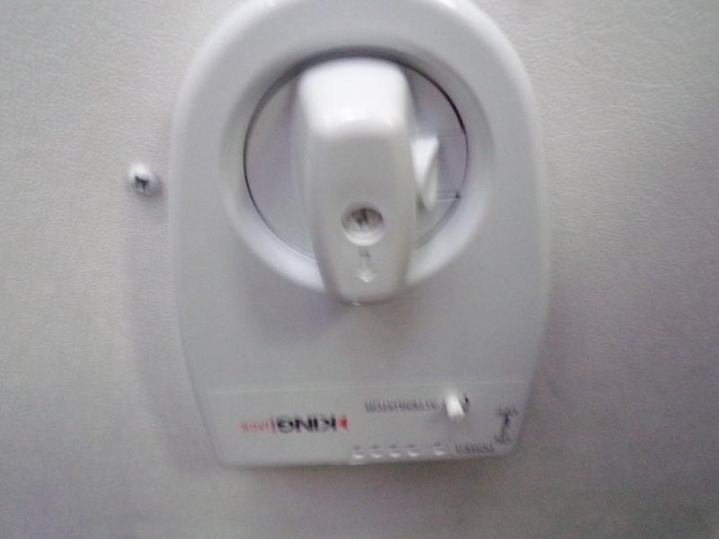Step inside, to your right is a queen bed that runs the width of the front wall of the trailer. There are overhead cabinets and a privacy curtain as well.
