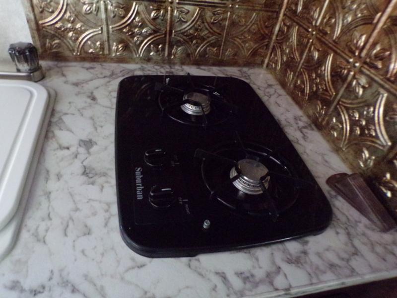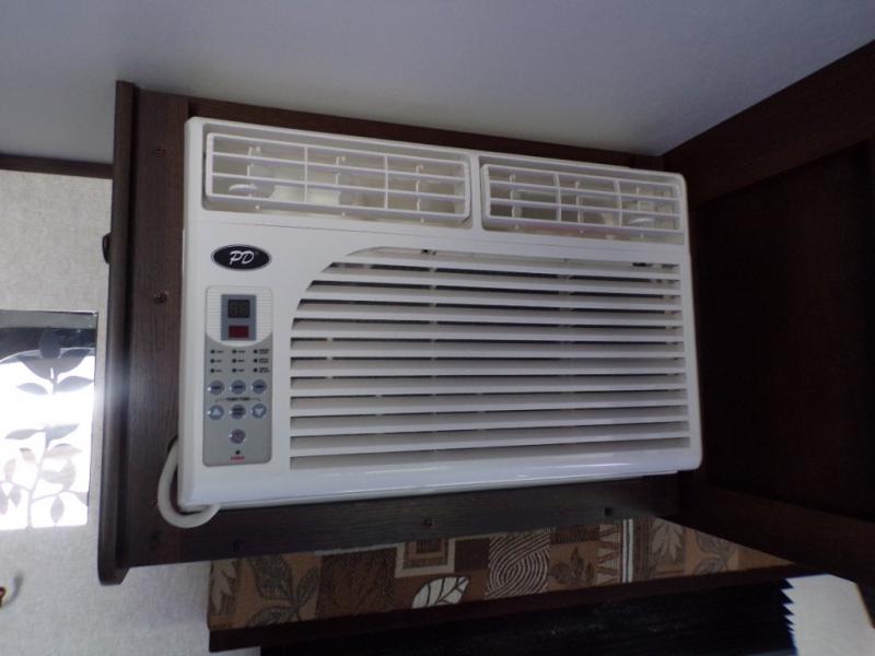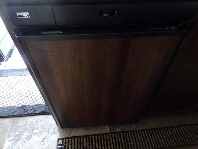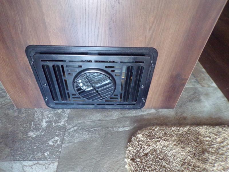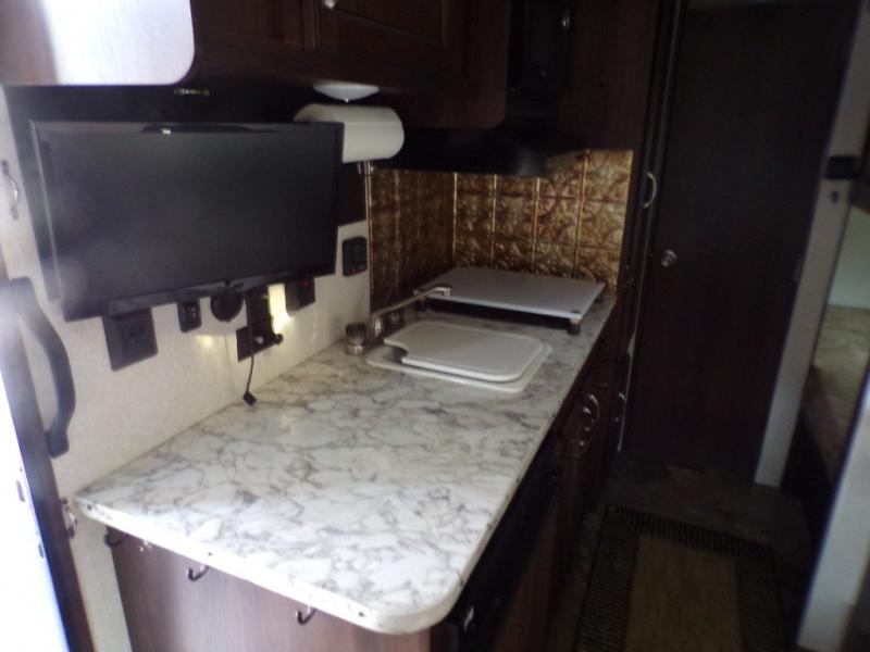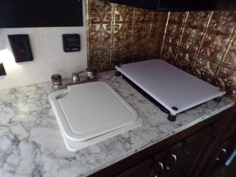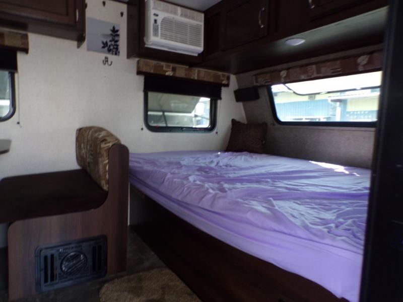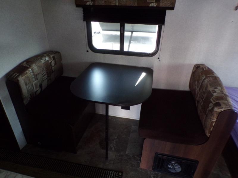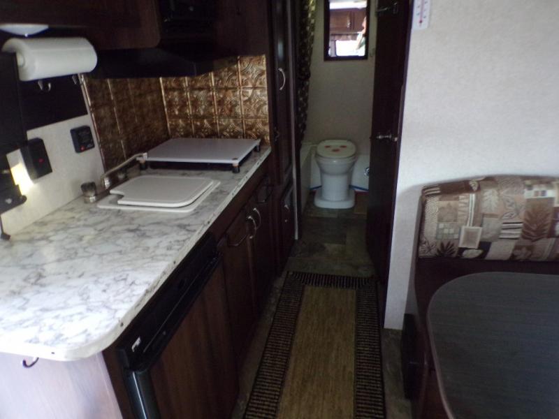 You can enjoy your meals at the booth dinette, and at night it easily converts into additional sleeping space. Along the opposite side there is a large pantry, two burner range, microwave, single galley sink, and a refrigerator below the counter.