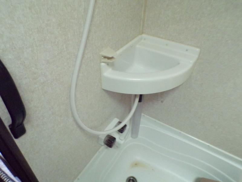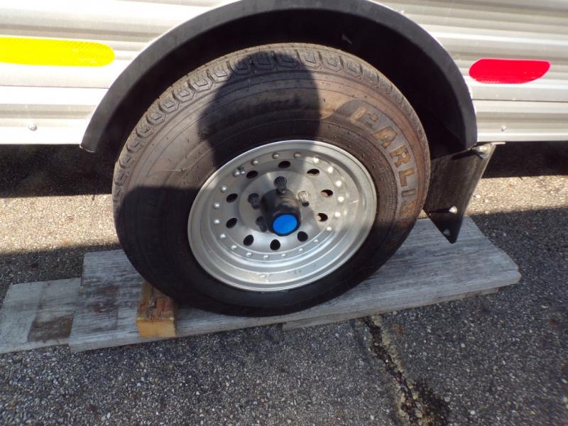 There are bunk beds in the rear right corner of the trailer. In the rear left corner you will find the bathroom with a toilet and tub/shower.