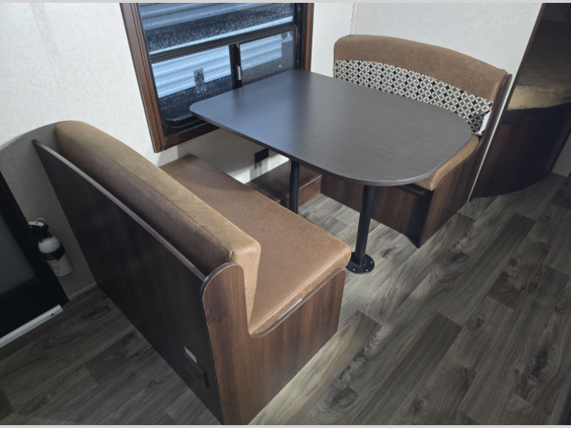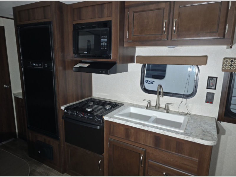 As you enter the travel trailer, to the left there is a dinette. Across from the dinette you will see a refrigerator, three burner range, microwave, and double kitchen sink. There is also a nice sofa in the main living area.