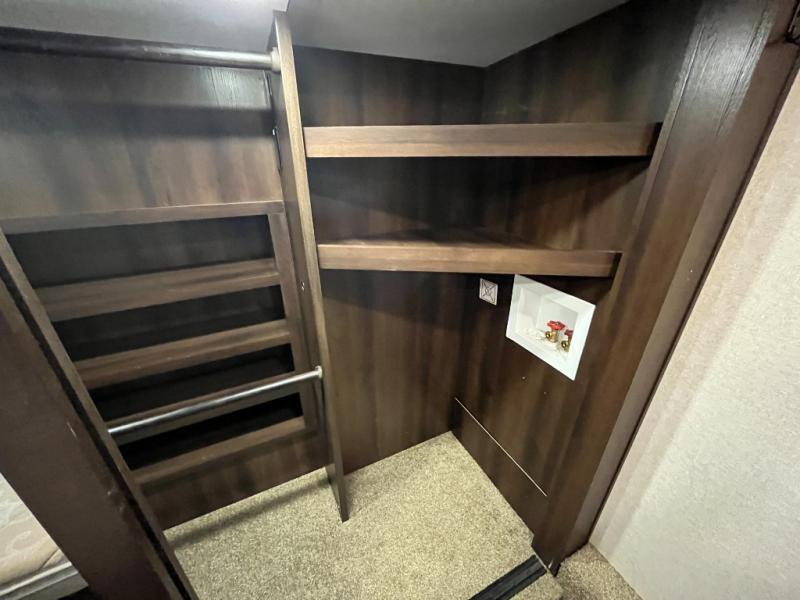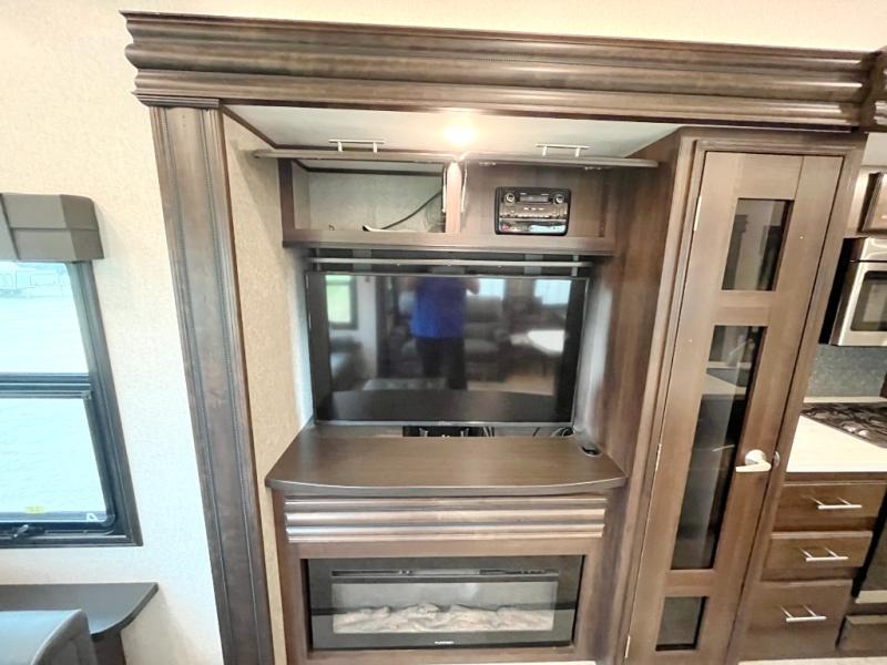 Enjoy camping with family and friends in this triple slide out Jayco North Point 315RLTS fifth wheel. You will have a welcoming feeling as you enter this model. In the kitchen there is a large hutch along the interior wall and spacious island with a double sink. The living area features a tri-fold sofa along the rear wall, a TV with a lift and a fireplace for those chilly evenings. In the private front bedroom there is a queen bed plus a walk-in closet for your hang up clothes. Outside you can add an optional tailgate TV and an optional 10' awning.