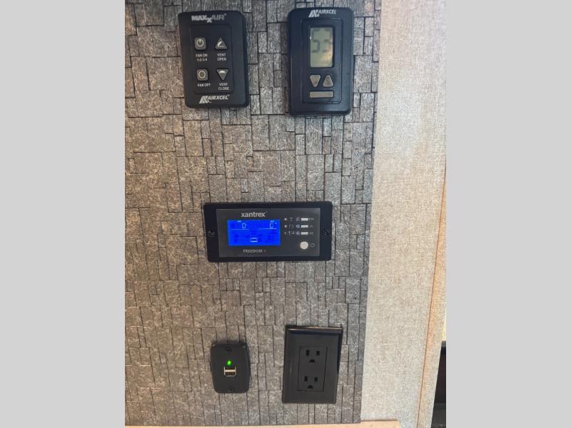 From the arched interior ceiling to the residential-grade wood-plank vinyl flooring, every detail exudes quality. The frameless G20 dark-tinted windows enhance privacy and style, while the slam-latch baggage doors make storage both secure and convenient. The North Point Luxury Package and Customer Value Package add upscale touches such as solid surface countertops, LED lighting, and multiple USB charging stations in the kitchen, living area, and bedroom.