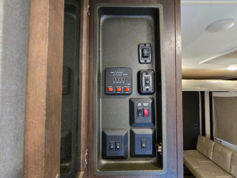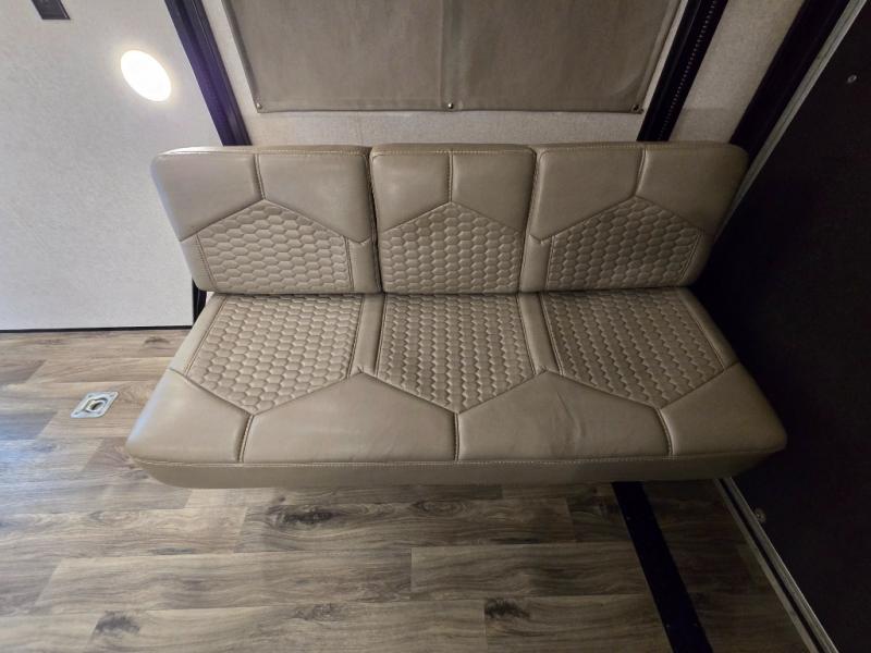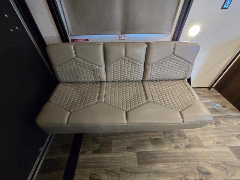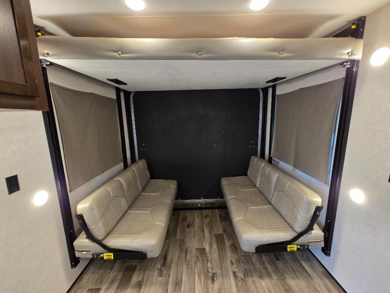 Thanks to the front queen bed, electric queen bunk, and convertible dual opposing sofas in the garage area with a table. -