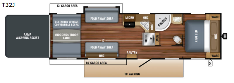 Traveling with this Octane toy hauler is the best decision you could make because this trailer includes a forty gallon fuel station, which means that you won't have to worry about running out of fuel or fun with your outdoor equipment. Sleeping eight people in this trailer is easy because of the electric queen-size bunk, convertible sofas, and fold-away sofas in the cargo area and the king-sized, Jayco-exclusive Simmons mattress in the front master suite. After cooking dinner each night on the 3-burner range top, you will find it easy to store the leftovers in the 8 cubic foot double-door refrigerator.