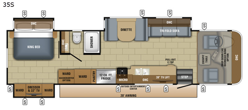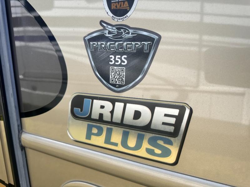 It's time to enjoy the open road experience in this Jayco Precept class A gas motorhome model 35S. You will find lots of floor space thanks to the triple slide outs allowing you to move around the coach with ease. The galley kitchen allows you to visit, watch the 39" TV on a lift, and prepare meals on the pull out countertop. The convenience of the comfortable Dream dinette allows you to sit, dine, or even sleep at night since the dinette mechanism easily raises and lowers the tabletop. And the king size bed gives you a space to unwind after a fun day. The outside entertainment center with an LED TV mounted on a swivel bracket and the single-disc DVD/FM radio offer an additional living area when you prefer to be outdoors. You can even choose to add a drop-down cab overhead bunk for more sleeping space, and much more!
