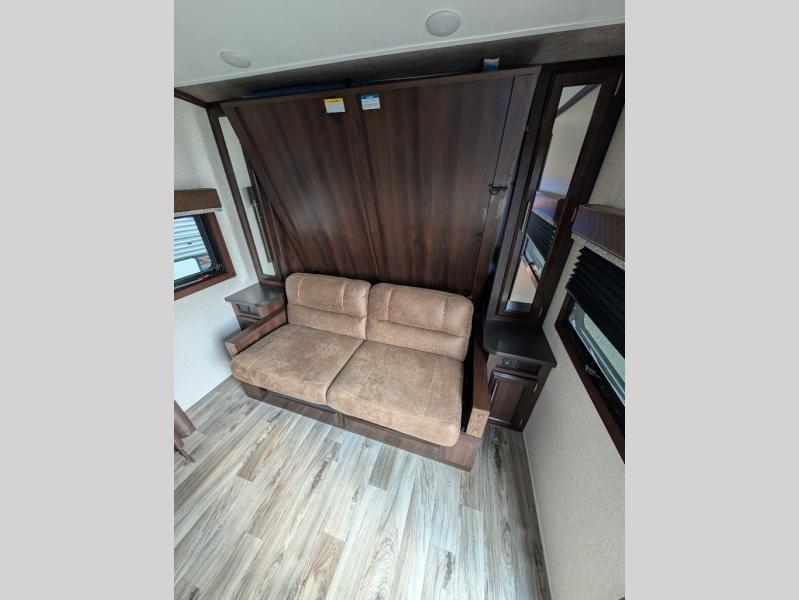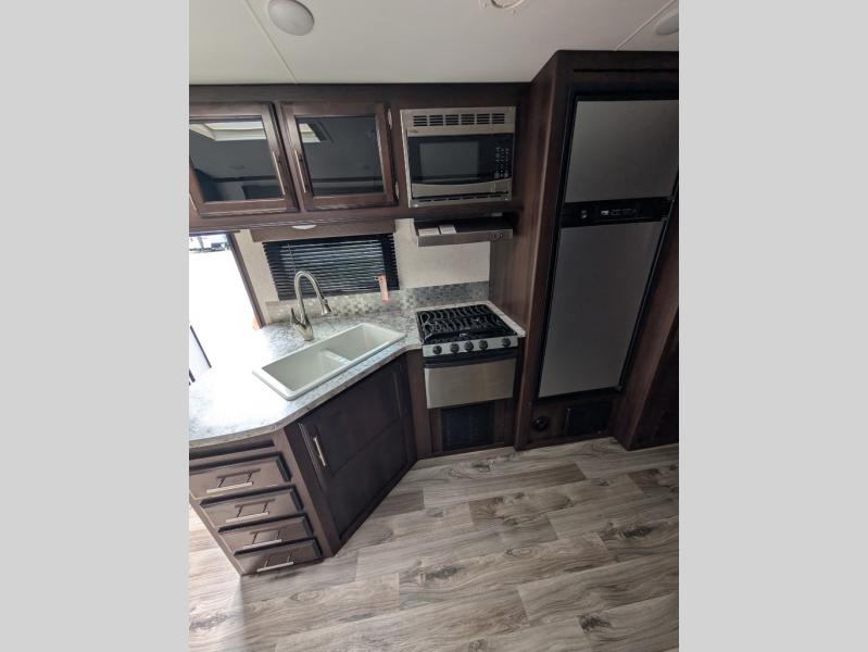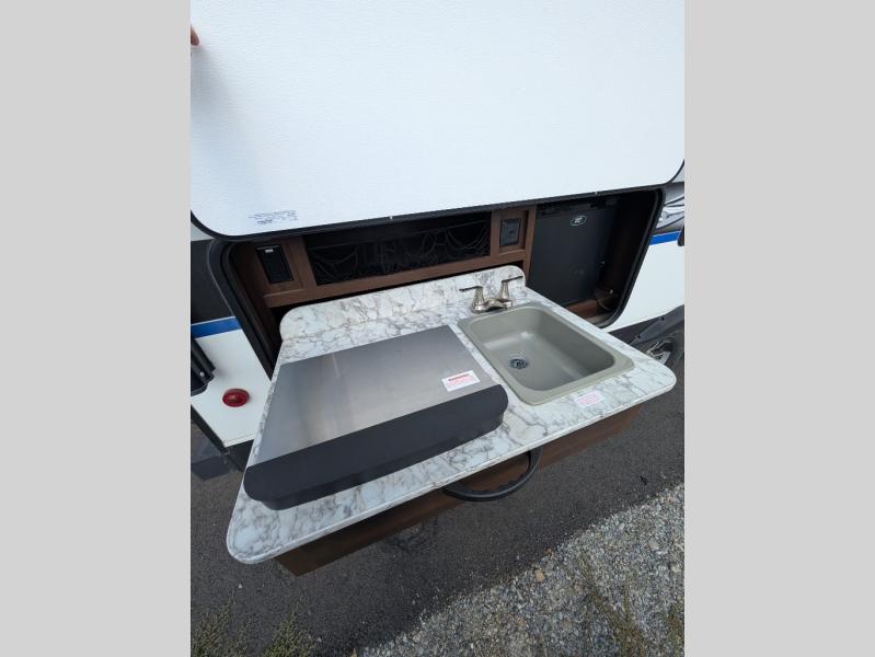 This White Hawk travel trailer is a wonderful addition to any family who is looking for an RV that delivers style and reliability. The residential appliances allow you to cook and store dinner with ease, and in this unit, you aren't restricted to only cooking dinner indoors because you can take the entire party outside of the trailer to the outdoor kitchen. After a long night of fun underneath the 20' electric awning, you can rest comfortably indoors on the Murphy bed with the Jayco-exclusive Simmons mattress.