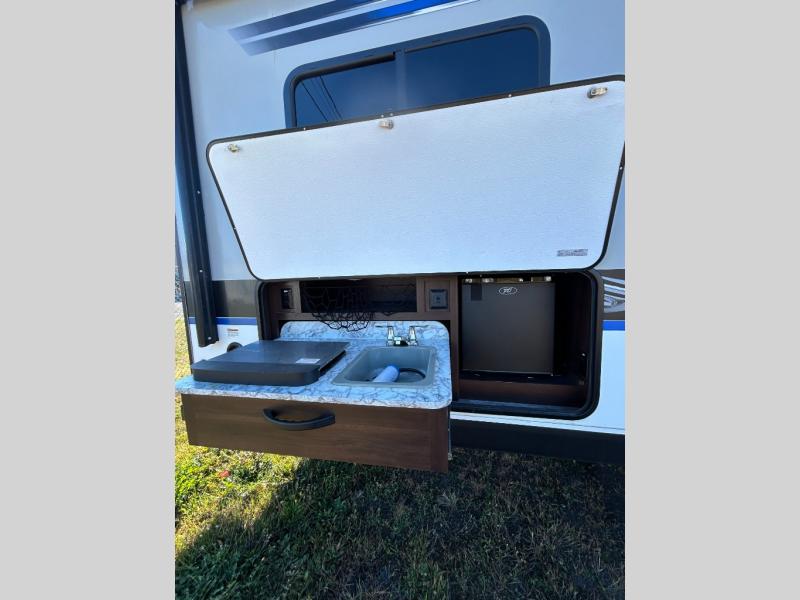 If you are searching for a greater peace of mind and added comfort, you will find them in this White Hawk travel trailer. This unit has a single slide that houses a U-shaped booth dinette which is able to fold down into a bed giving you the space you need to sleep four people in this trailer, and you don't have to sacrifice the privacy that you are accustomed to because a separate bedroom with a Jayco-exclusive Simmons mattress is located in the rear of this model. All of the residential-sized stainless steel appliances make meal preparations a breeze, but if you prefer a little fresh air while you cook, you can take your preparations to the outdoor kitchen.