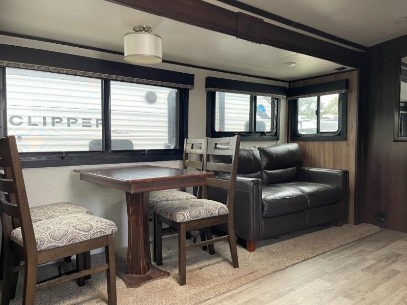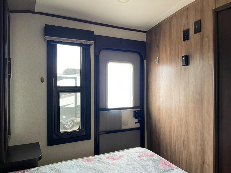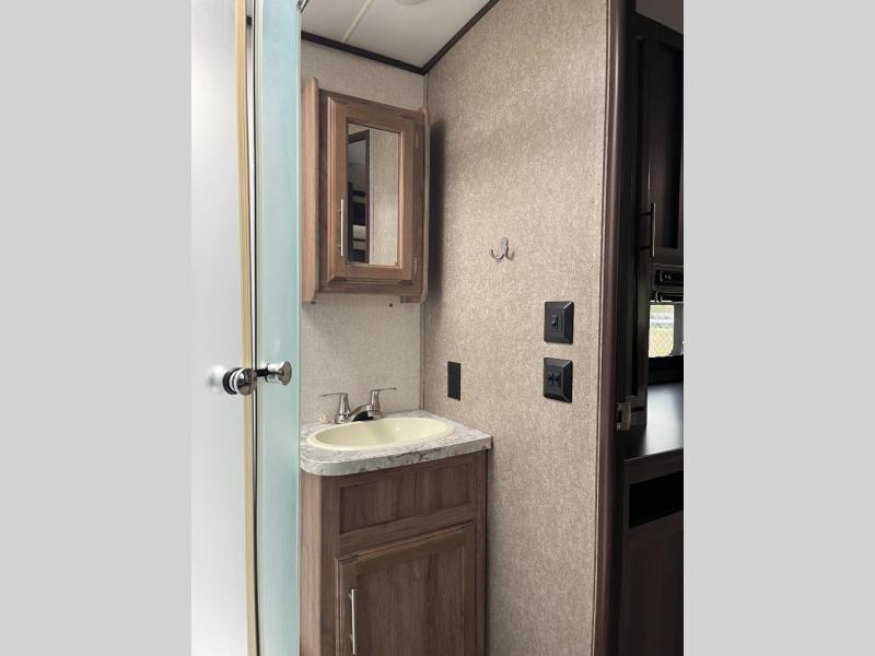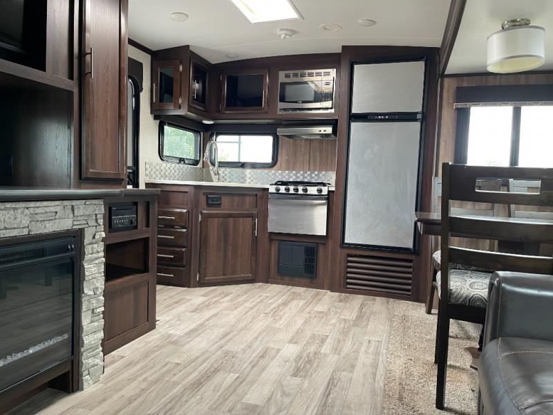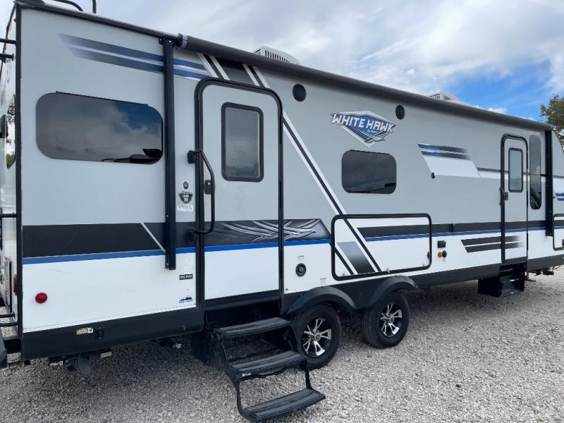 For worry-free family fun, take your next adventure in this White Hawk travel trailer. The booth dinette and tri-fold sofa add plenty of seating space to the living area so that you can enjoy a movie night on the 39" LED TV with the whole family, and the rear kitchen with residential appliances gives you the perfect space to create those movie-night snacks everyone loves. The walk-through bathroom gives you the extra room that you need as you get ready for the day, and the skylight brightens up the entire space with the sunshine that it brings in each morning. Because this trailer has two entry/exit doors, the front bedroom is able to have its own private entrance to and from the trailer.