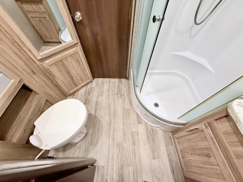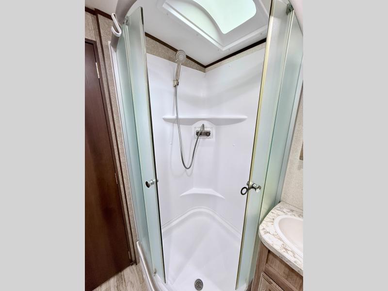 Nothing could be more reliable and comfortable than this White Hawk travel trailer because of the quality it has been built upon. Each amenity added into this trailer has both style and purpose, like the arched ceilings and stainless steel residential appliances. The two slides on this trailer allow you to have extra space for the Jayco-exclusive Simmons mattress and U-shaped booth dinette which give you the room that you need to sleep six people easily, and each morning the sunlight shining through the skylight in the large walk-through bathroom will revive you for the adventures ahead that day.
