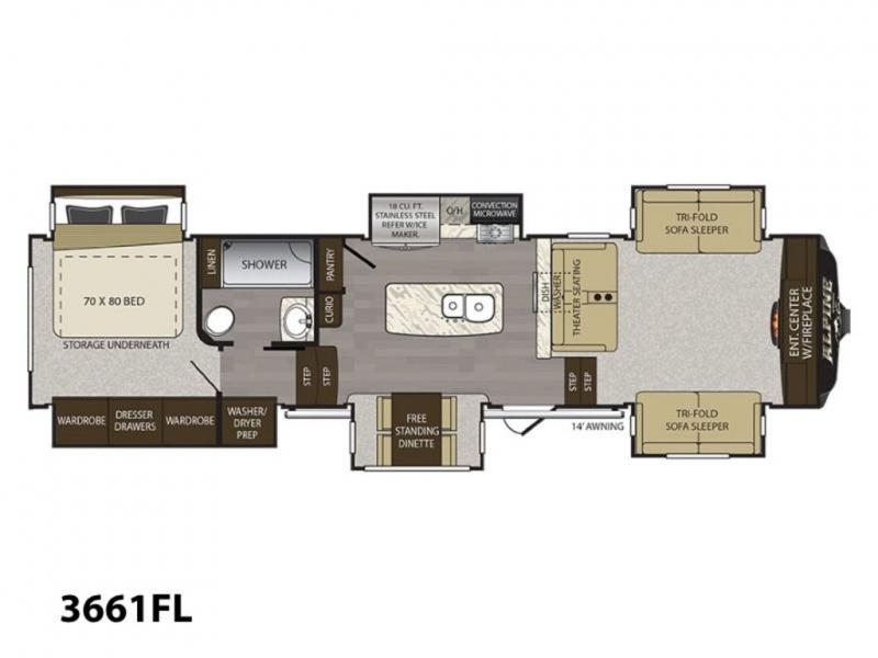 Model 3661FL is identical to 3660FL except this model includes an 18 cu. ft. residential refrigerator. So if SIX slides in a fifth wheel gets you excited then you will be amazed at the space inside the Keystone RV Alpine 3661FL with it's front living room layout and slides that provide maximum walking around room in every area of this unit.