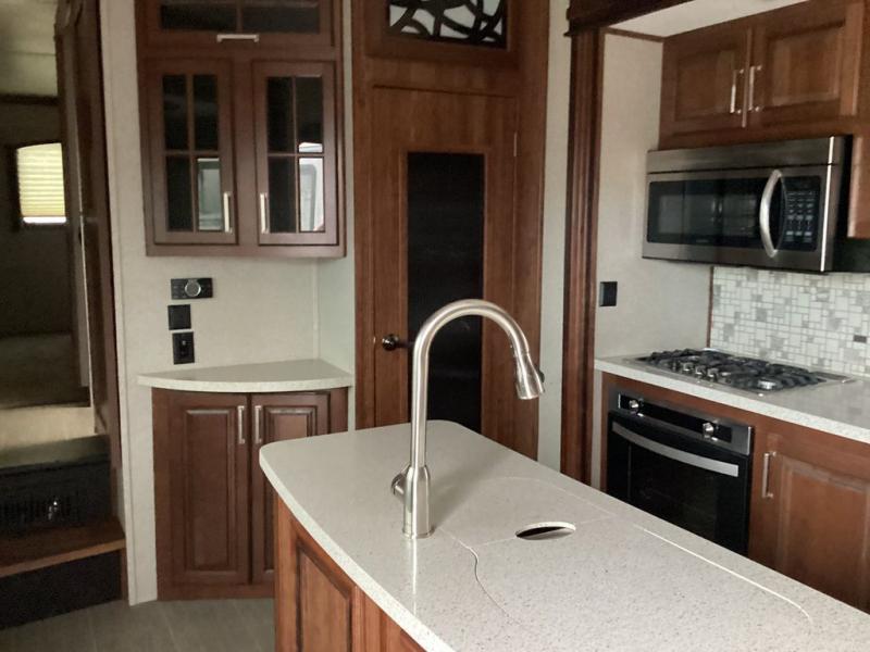 Step inside and find yourself in a kitchen that is as spacious as home. There is a free standing dinette slide with four chairs to the left of the door, a large kitchen island with double sink, and a second slide featuring a 18 cu. ft. residential refrigerator, three burner range, and convection microwave. Plus, there is a pantry off to the side as well as two curios, and overhead cabinets throughout for dishes and things.