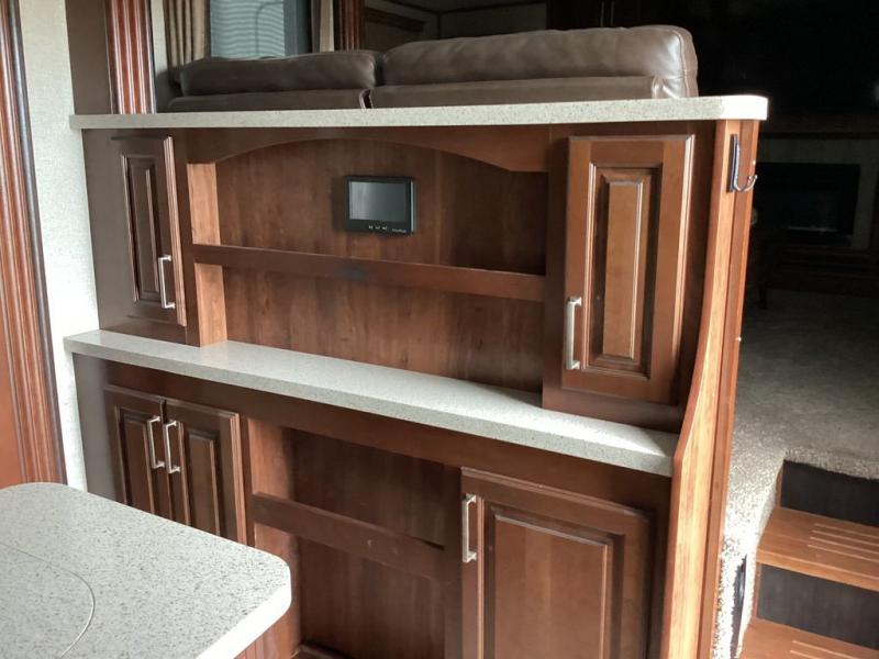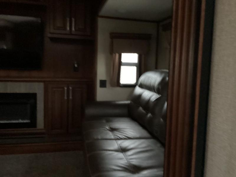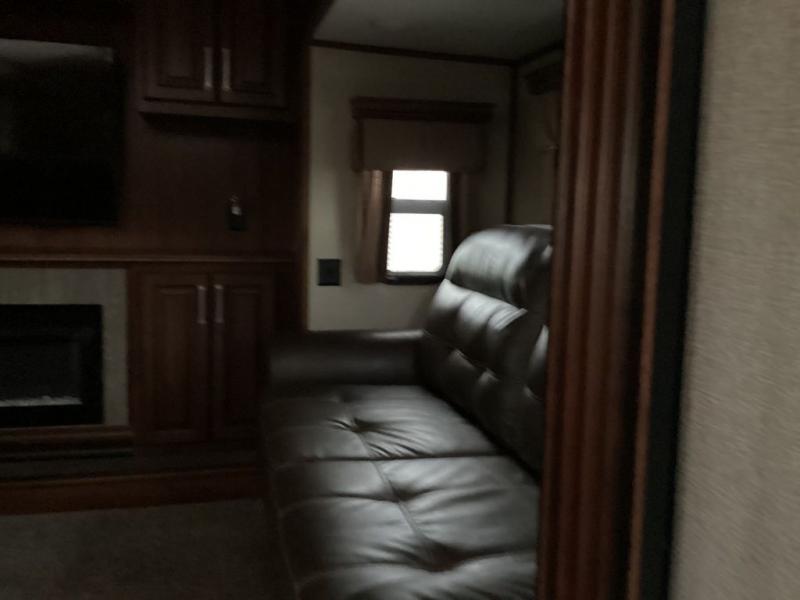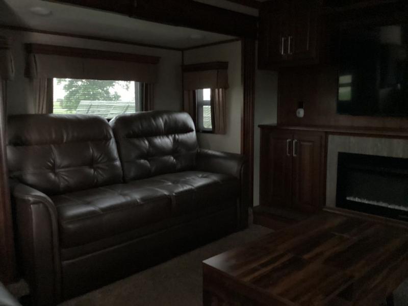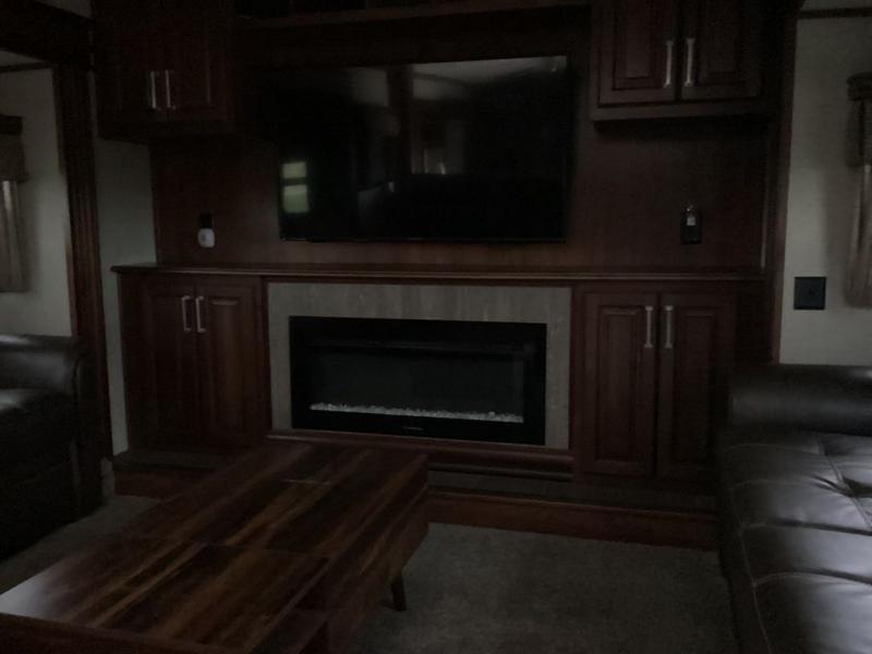 Head up the steps to your right from the kitchen to a front living space also featuring dual slides. There is an entertainment center with a fireplace along the front wall. In the living room you will find dual opposing slides, and each slide has a tri-fold sofa sleeper. Across from the entertainment center there is theater seating with cup holders. The perfect place to entertain, relax, and provide sleeping space for extra guests if needed.