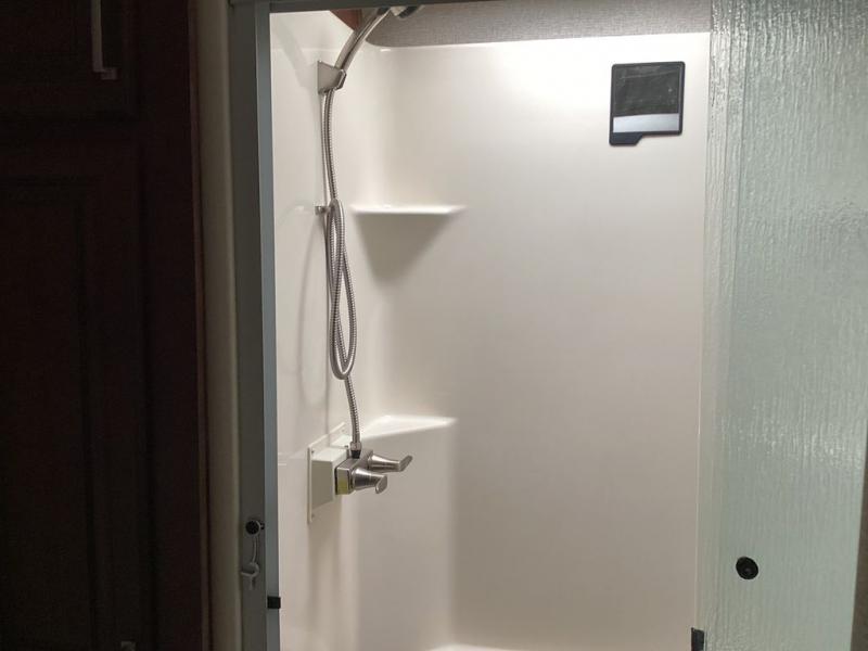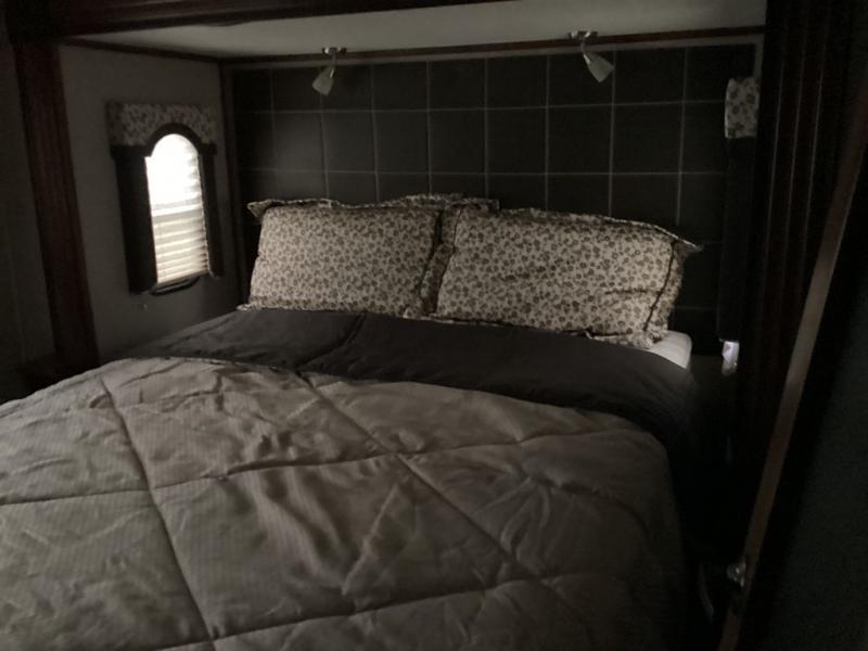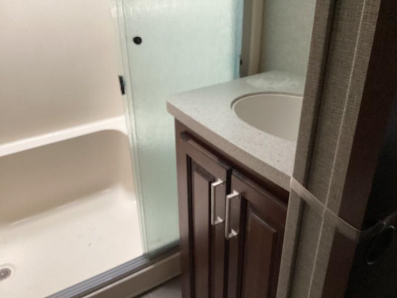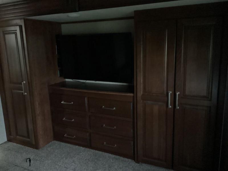 The bedroom features a king bed slide with storage underneath on the roadside, and dual wardrobes with dresser drawers on the opposite side slide out. Plus there is a washer/dryer prepped location within the bedroom slide that is accessible from the hall across from the bath.