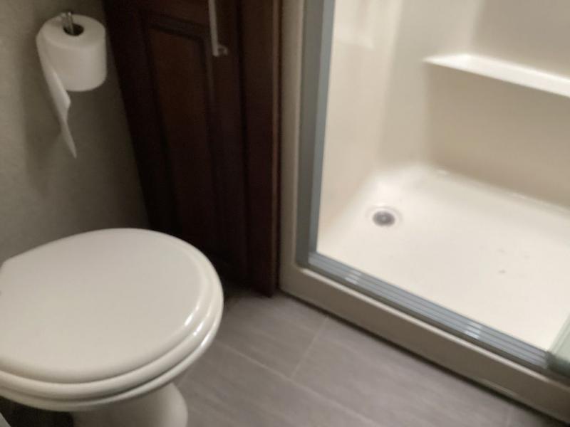 Make your way through the kitchen and head up the steps to the rear master bedroom and bath. The bath is at the top of the stairs and features a shower, toilet, sink, and linen cabinet.