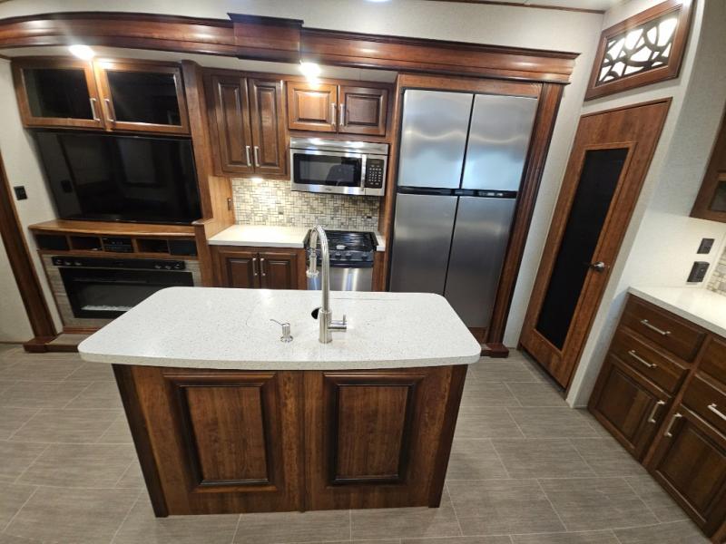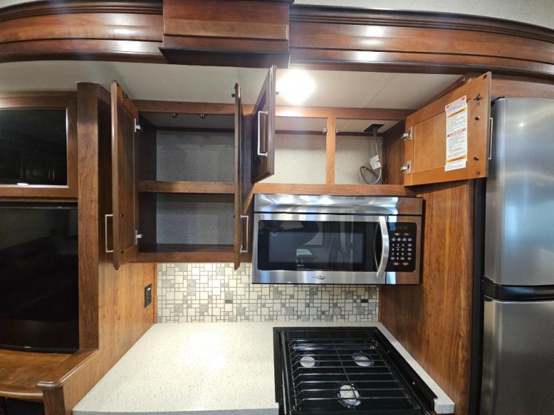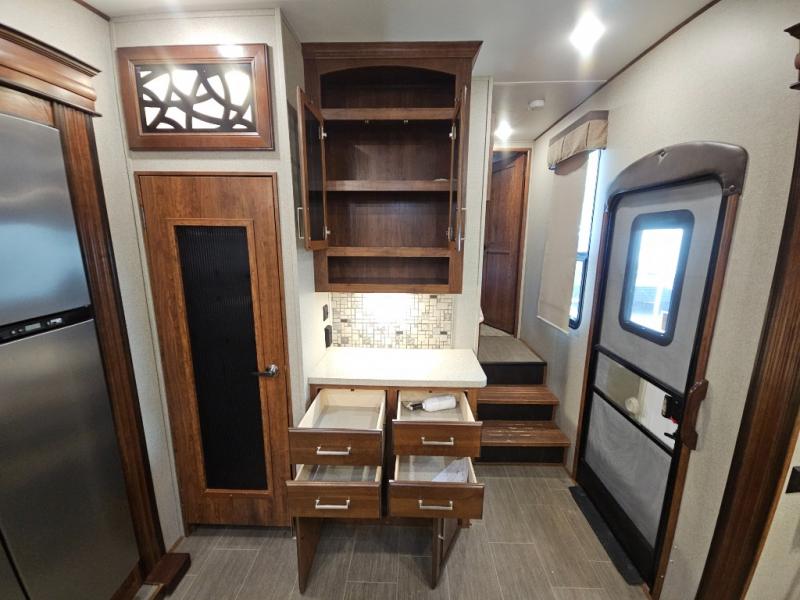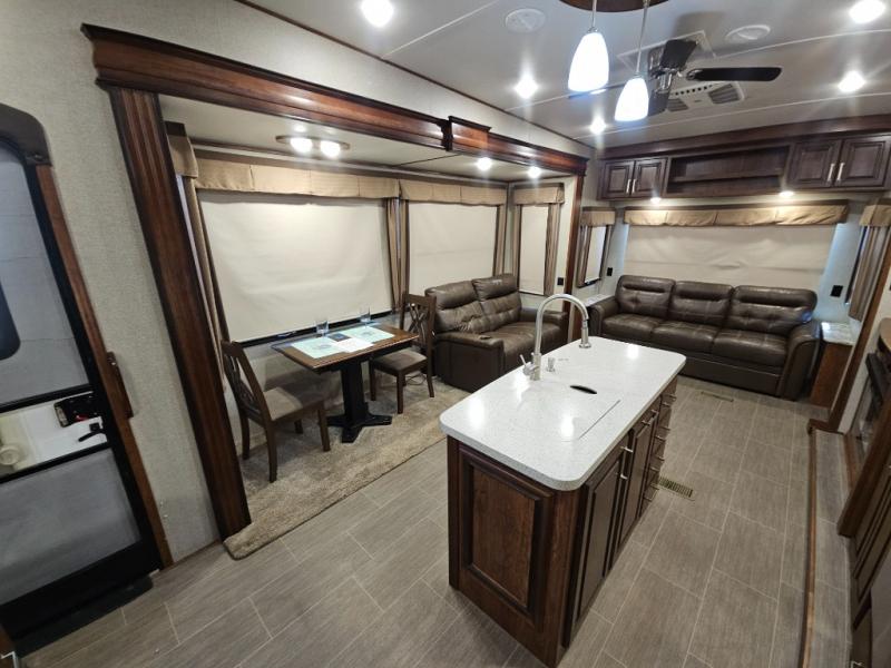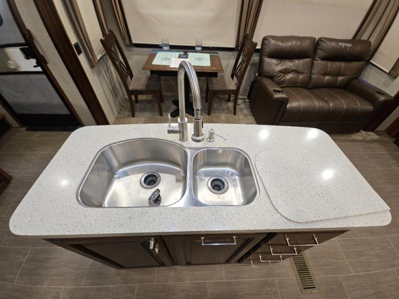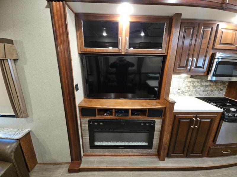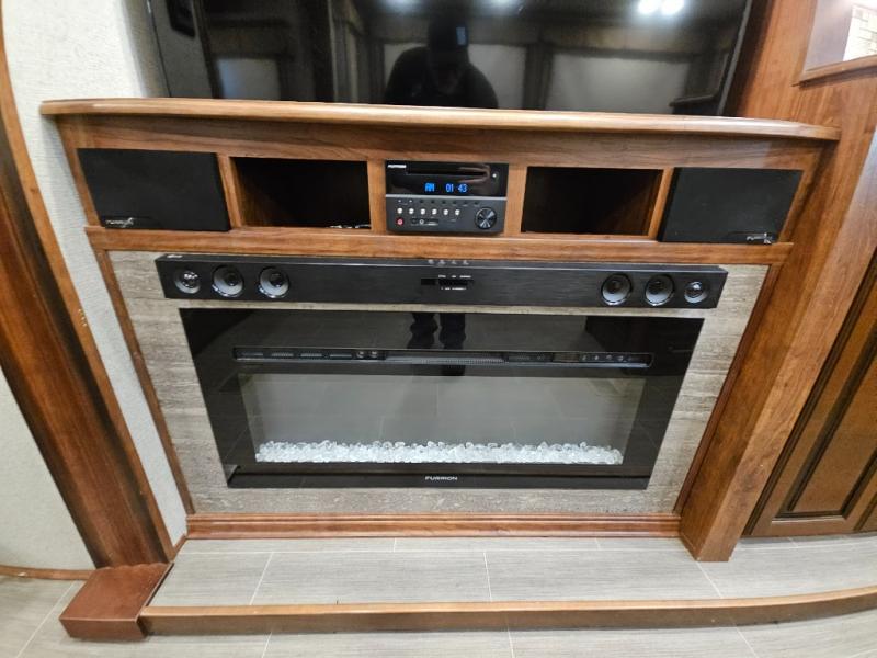 The perfect fifth wheel for entertaining and relaxing is this Keystone Avalanche model 320RS. The combined living and kitchen area includes dual slide outs for more walking around floor space, plus seating for 9 people with the furniture provided. This unit offers an 18 cu. ft. refrigerator, and a kitchen island for serving appetizers and cleaning the dishes in the sink. There is an entertainment center and a 50" LED TV for your inside enjoyment with a fireplace to keep you warm, plus a pantry, curio, and much more!