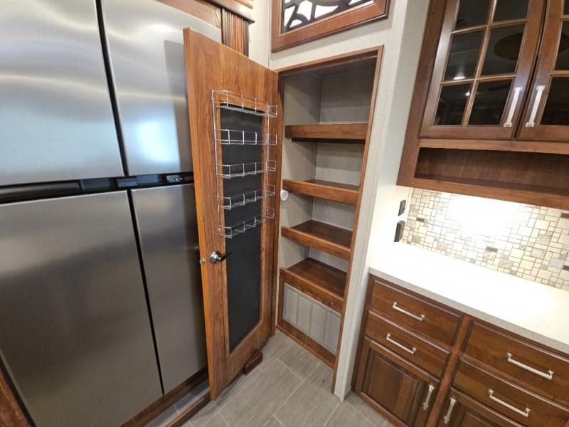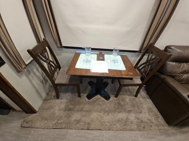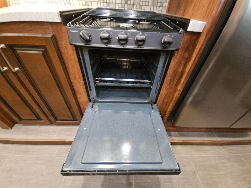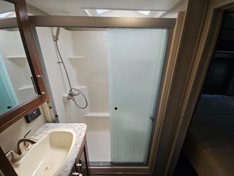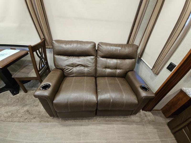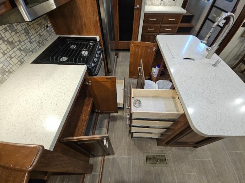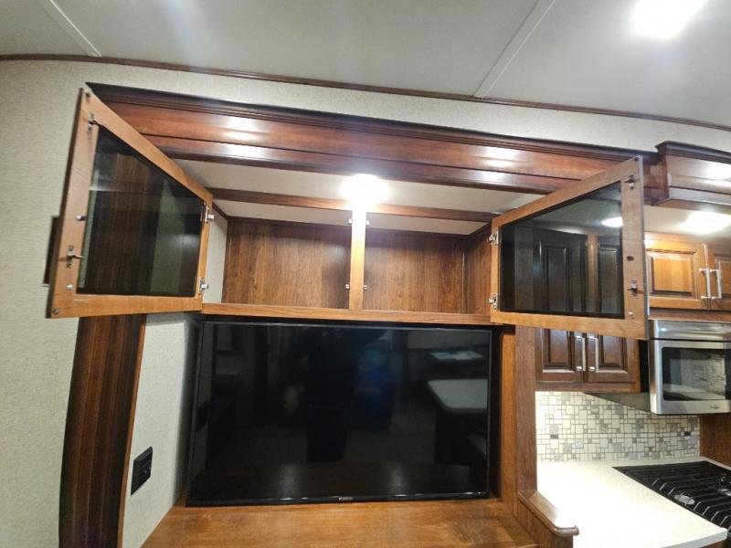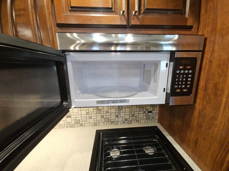 The perfect fifth wheel for entertaining and relaxing is this Keystone Avalanche model 320RS. The combined living and kitchen area includes dual slide outs for more walking around floor space, plus seating for 9 people with the furniture provided. This unit offers an 18 cu. ft. refrigerator, and a kitchen island for serving appetizers and cleaning the dishes in the sink. There is an entertainment center and a 50" LED TV for your inside enjoyment with a fireplace to keep you warm, plus a pantry, curio, and much more!