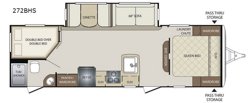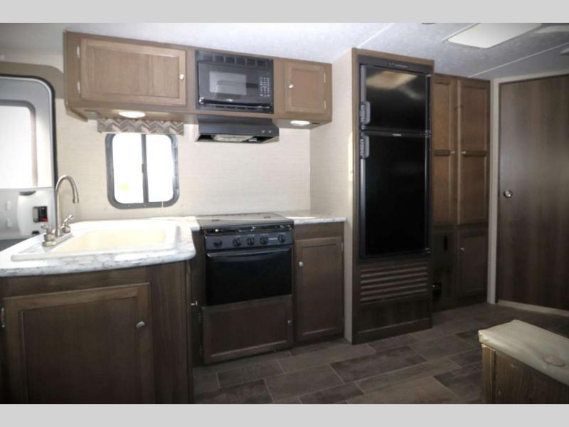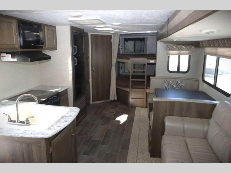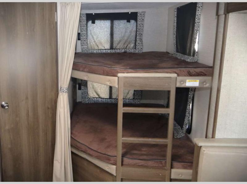 Your family of nine will enjoy any camping trip with this Bullet 272BHS travel trailer. This is the ideal trailer for a large family. A few key features include a single slide out which helps to maximize the living space and a rear bathroom with a private outside entrance. Your kids will enjoy the double over double bunk beds which have a ladder for easy access to the top bunk plus there is a privacy curtain. In the kitchen area you can store your canned goods in the large pantry, and your perishables in the 6 cu. ft. double door refrigerator and more!