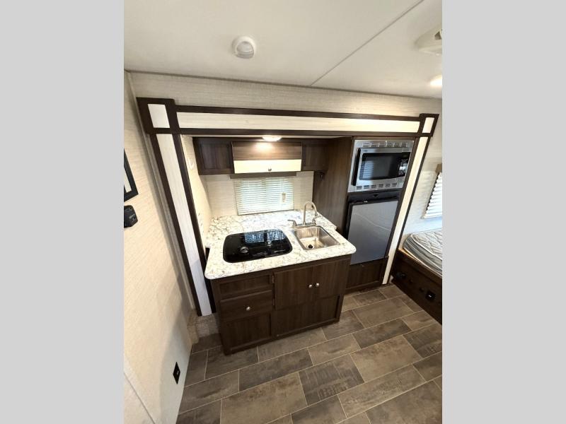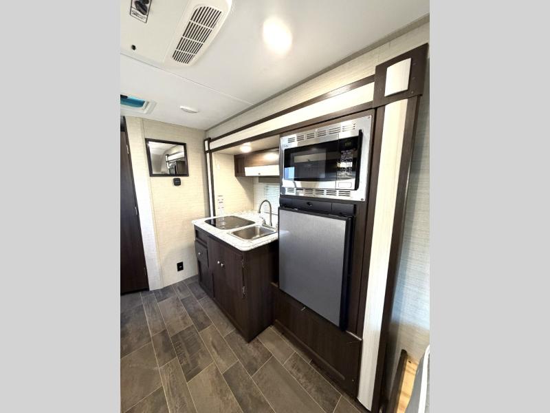 To the right of the entry door there is a booth dinette for two including overhead storage, and a spot just right for adding an optional 24" LED TV. Opposite, along the road side, you will find a slide out refrigerator, a two burner cook-top, and a single bowl sink.