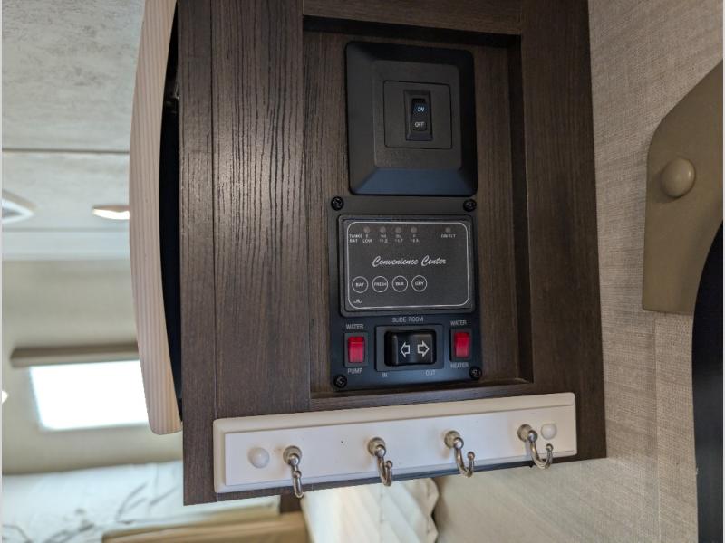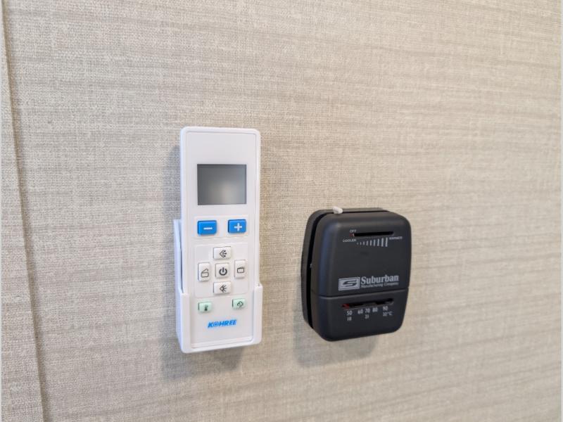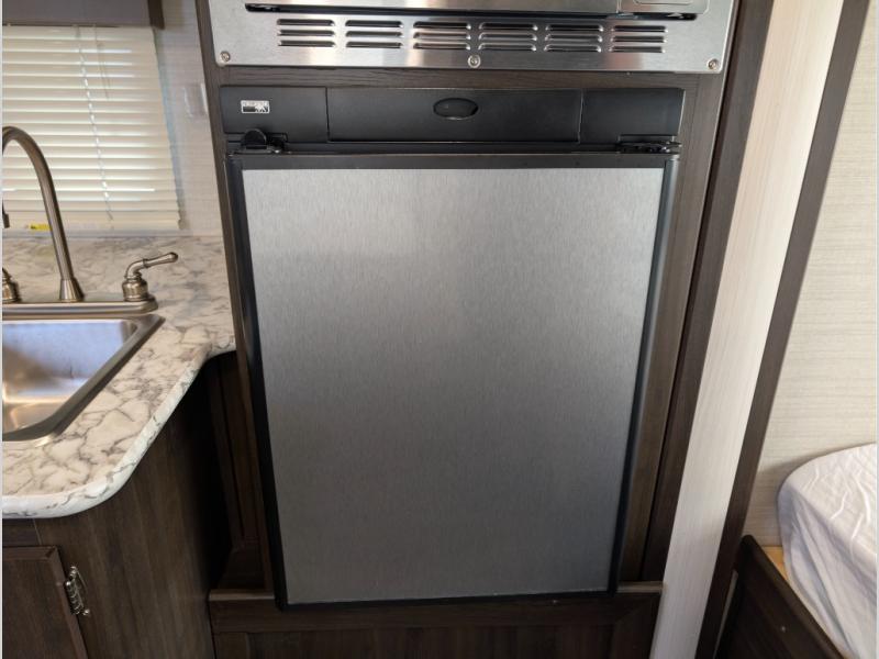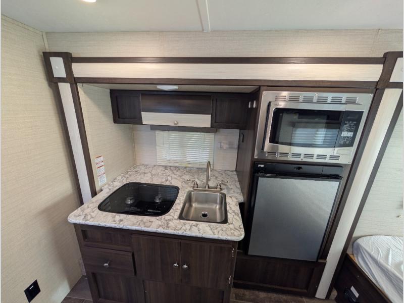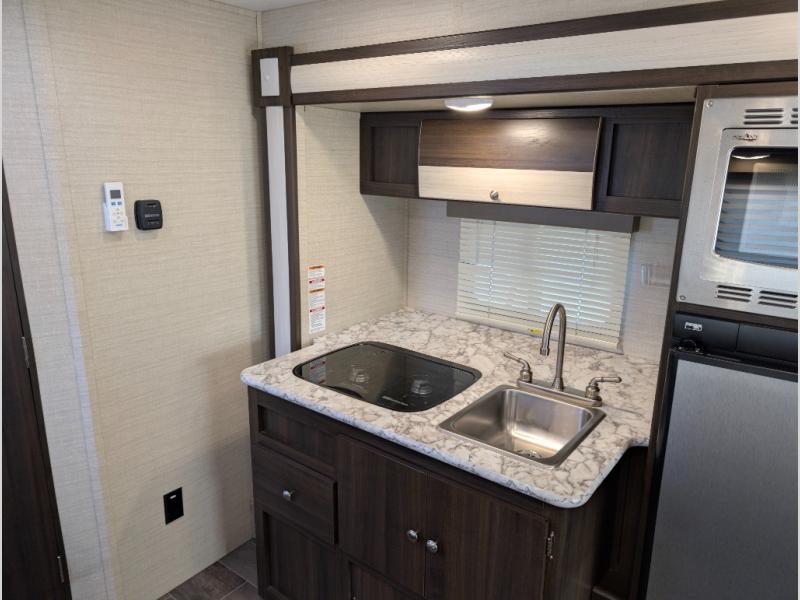 To the right of the entry door there is a booth dinette for two including overhead storage, and a spot just right for adding an optional 24" LED TV. Opposite, along the road side, you will find a slide out refrigerator, a two burner cook-top, and a single bowl sink.
