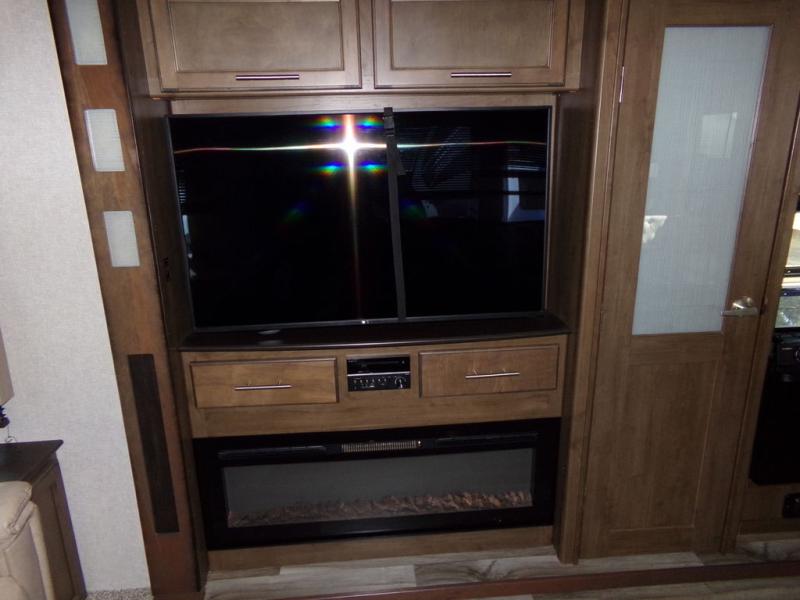 This Cougar fifth wheel 344MKS will have you envisioning all the campgrounds you will visit this year. You might even decide to invite the grandkids on a few of the trips thanks to the extra sleeping space on the furniture when folded down. Once at your destination, you can began setting up the inside by pushing the button to open up the triple slides for more interior floor space. The cook can began making dinner with all the counter space from the kitchen island and storage in the pantry. You might even watch TV, rest by the fireplace, or take a nap in the master bedroom. You will find plenty of storage for your clothes in the bedroom's full height wardrobe and dresser. Outside, the unobstructed pass-through storage allows you to bring along larger outdoor camping items, and the two awnings offer an outdoor living space protected from the elements. Take a look inside and outside, then load up for your next trip.