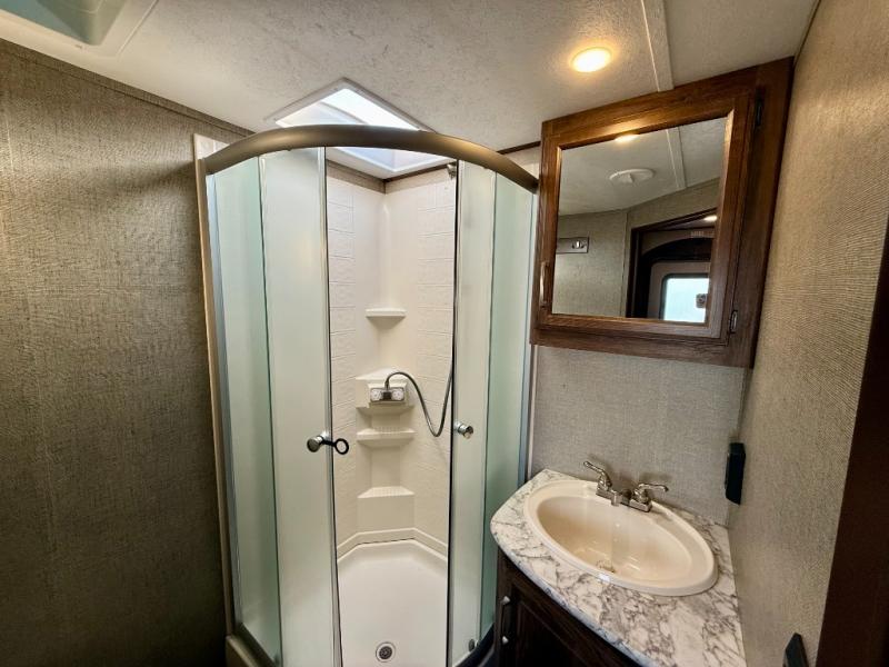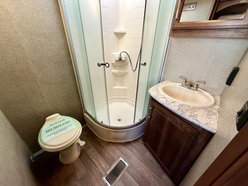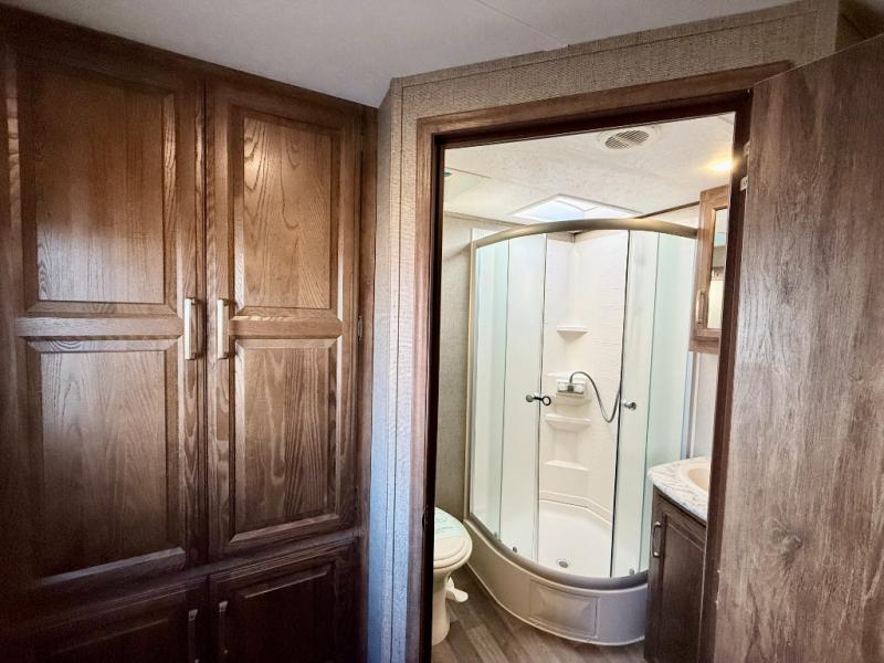 As you enter model 21RBSWE you will find a closet/pantry to the left of the door for convenient storage. Straight ahead there is a rear corner bath which provides a neo-angled shower, toilet, and sink.