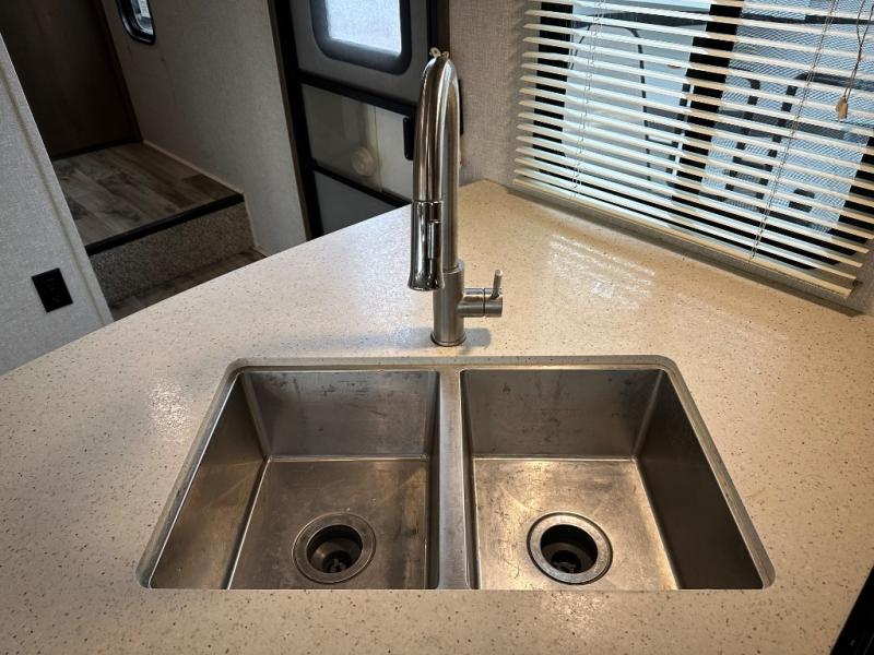 If you are a couple or family of 3-4 that enjoys camping in a fifth wheel, take a look at this Keystone Cougar Half-Ton Series model 25RES. The Hitch Vision backup mirror provides a safe and easy way to hitch up and park at any destination. Outside, you can enjoy grilling on the capital grill and storing your drinks in the mini refrigerator while visiting with other campers. The two slide outs provide more interior floor space, and the rear entertainment center including storage allows you to relax inside while the chef is cooking, plus there is more to see!